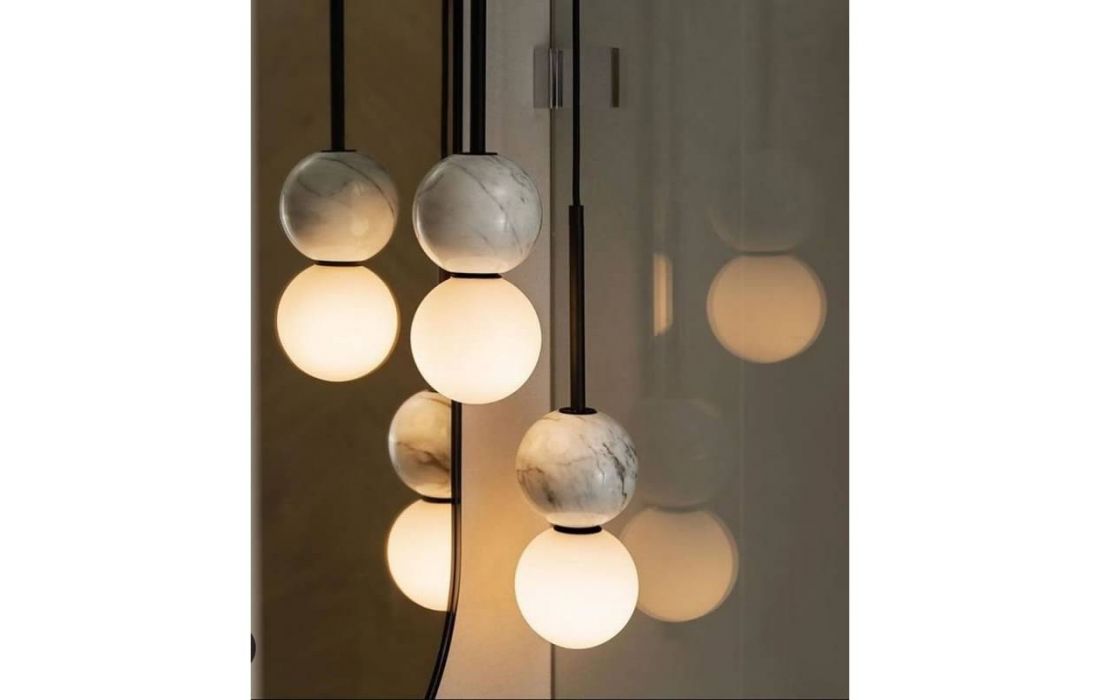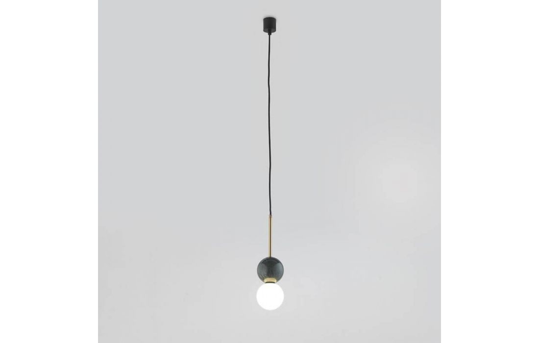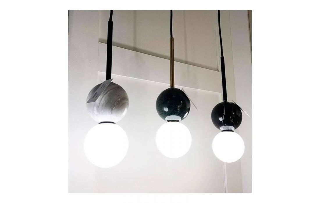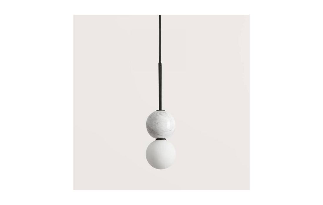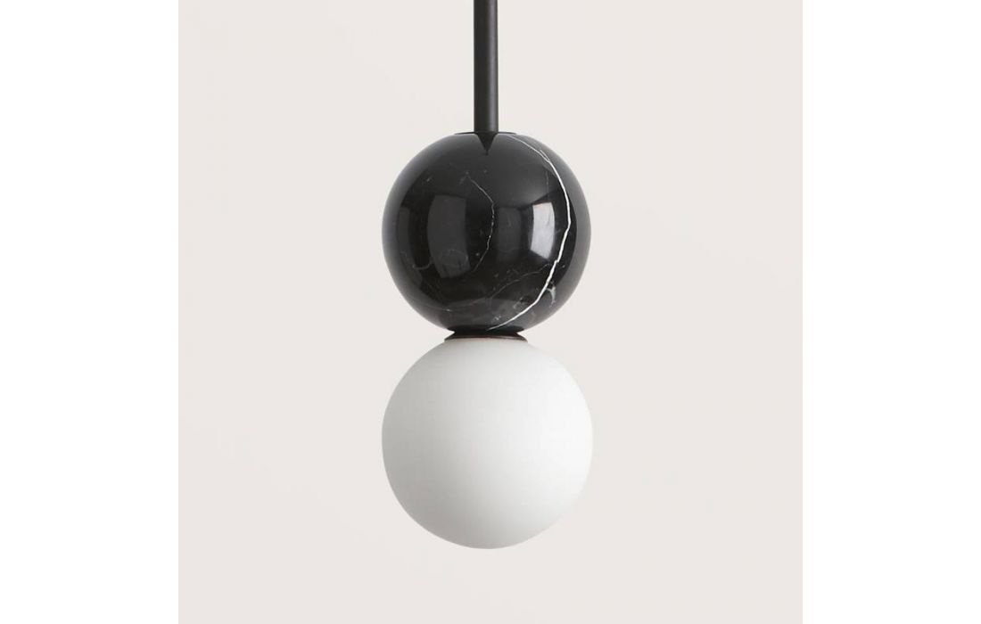 The Dalt pendant lamp is a sophisticated combination of materials and shapes that come together with a design that evokes times gone by, with an upper sphere in opal glass and a lower sphere in white, black or green marble. Base in black metal or aged gold (depending on the color of the chosen marble).