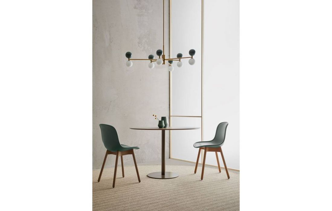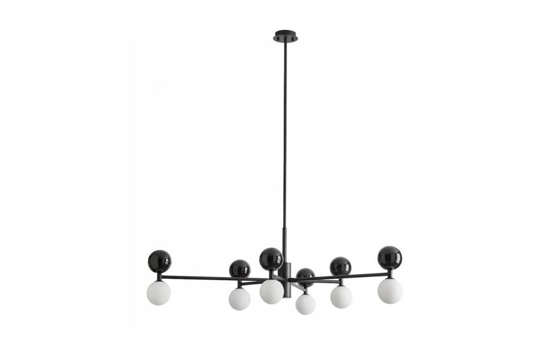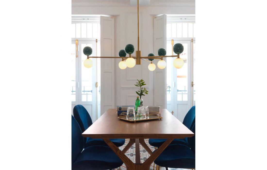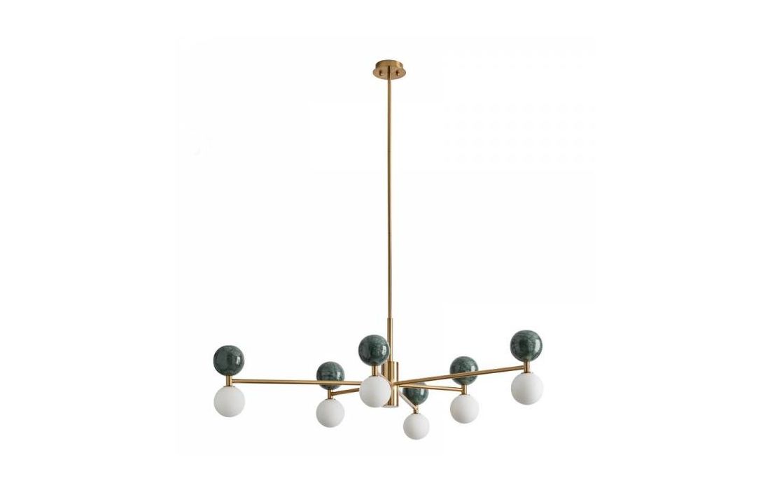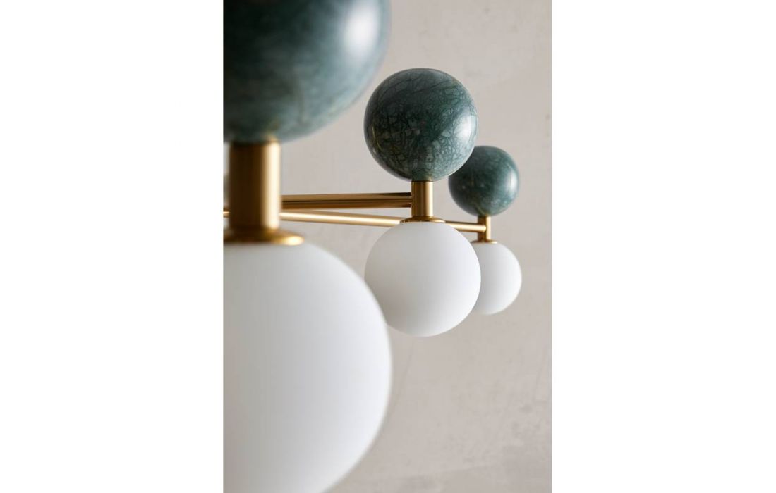 The Dalt pendant lamp is a sophisticated combination of materials and shapes that come together with a design that evokes times gone by, with an upper sphere in opal glass and a lower sphere in black or green marble. Base in black metal or aged gold.