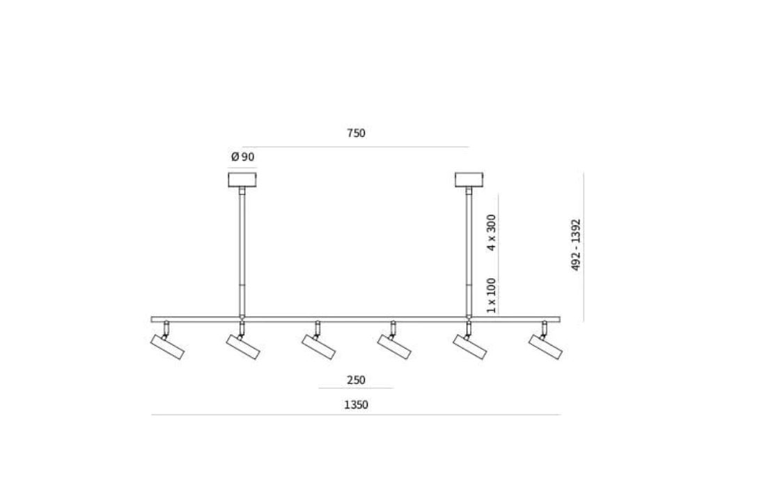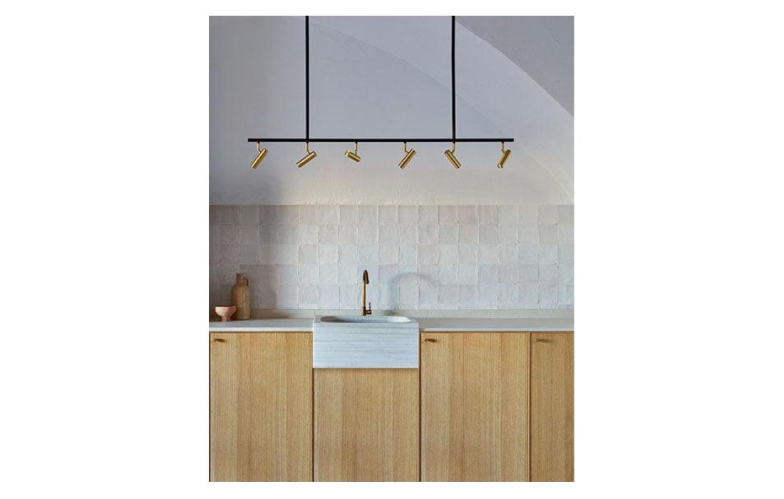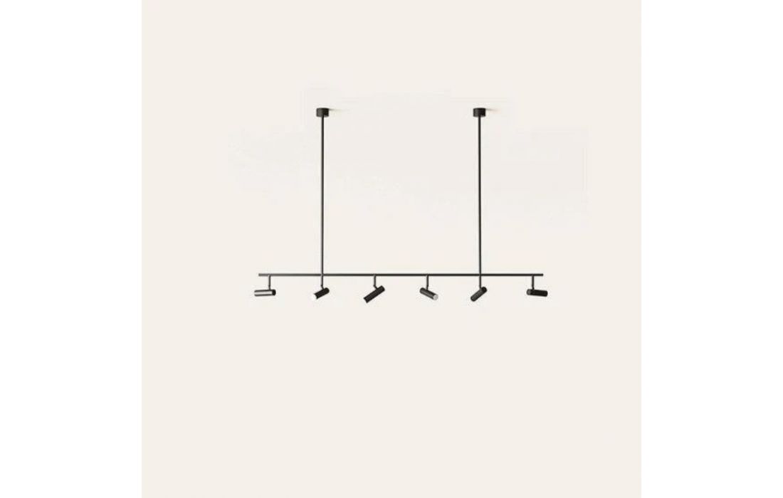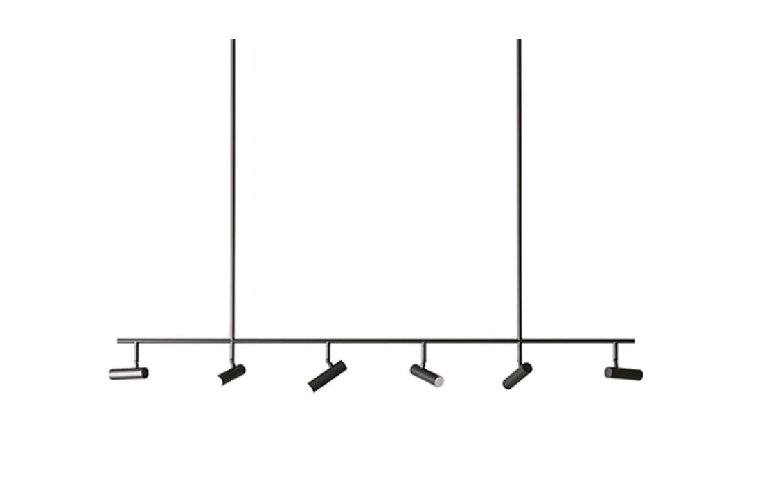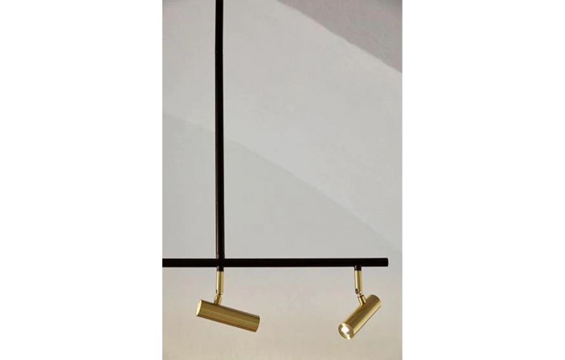 Suspended lamp with six directable spots. its attractiveness is based on a solid and versatile design, with an innovative aesthetic that gives style to the spaces, with a steel structure painted in matt black or old gold.