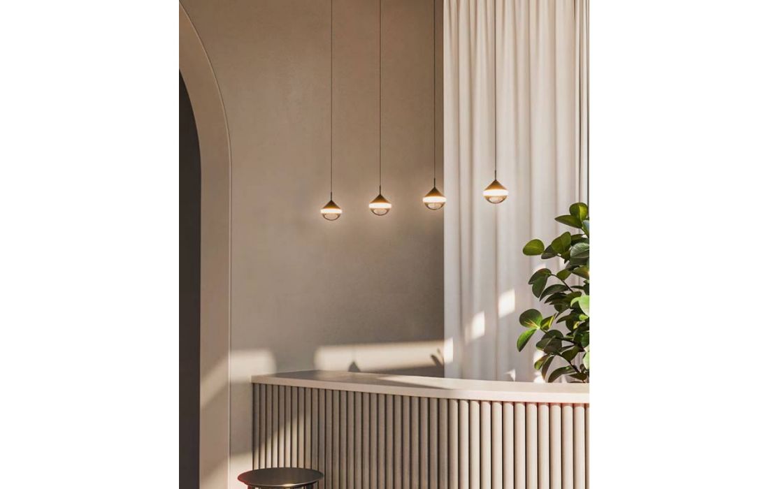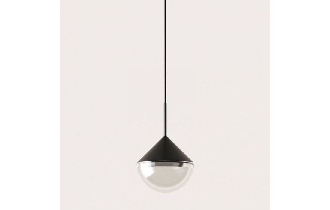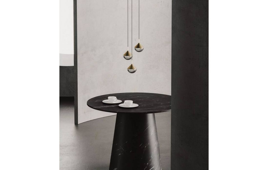 Pendant lamp with elegant design, pure and striking lines. An impressive mix of materials that give rise to a signature piece, with a light diffuser in transparent optical glass with a base in black marble or in matt gold.
