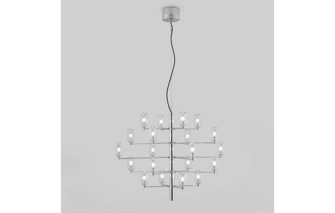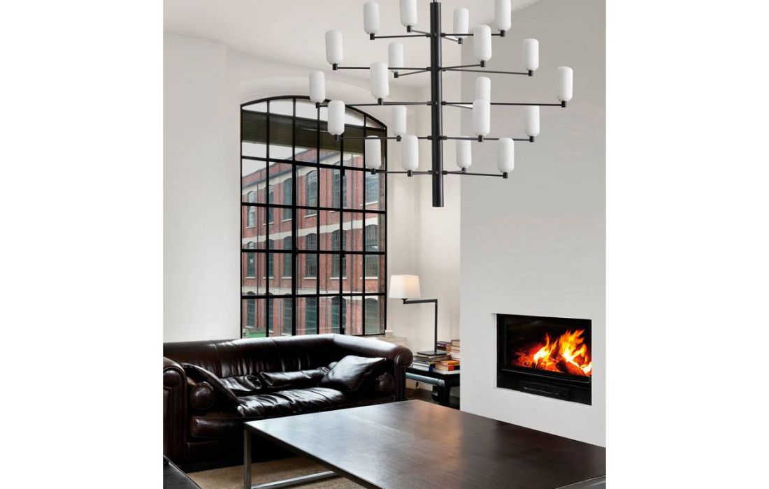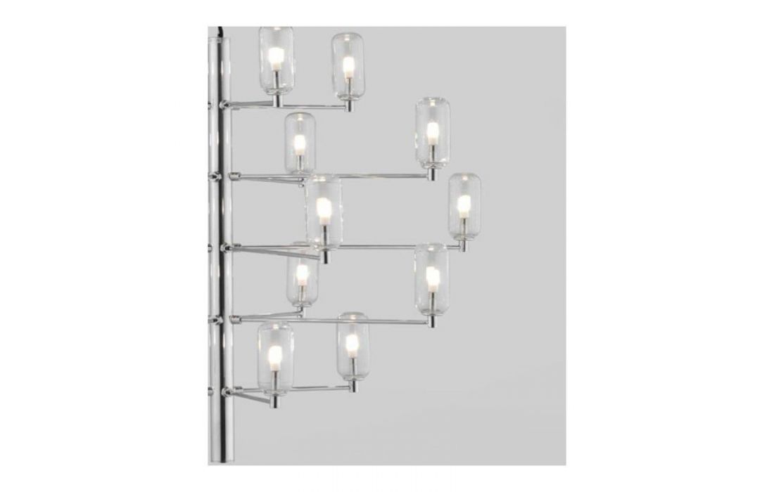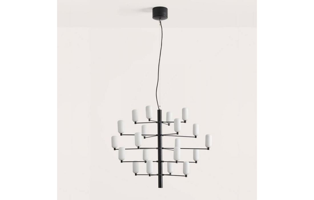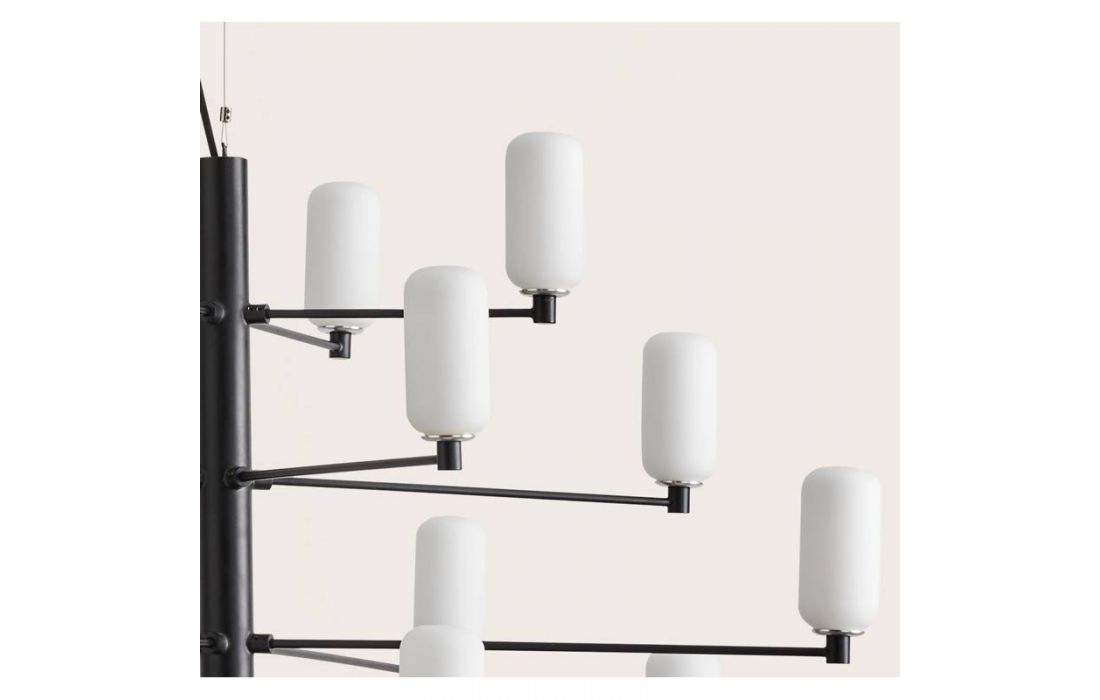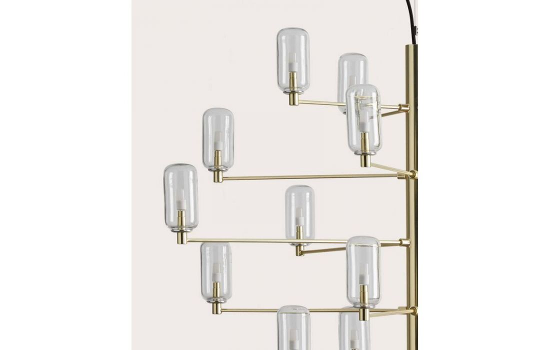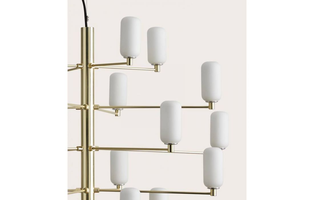 Suspension lamp Gand falls in love at first sight. It stands out for its balanced structure of delicate arms that present us, like a bunch, the tulips in blown glass in opal or transparent glass.