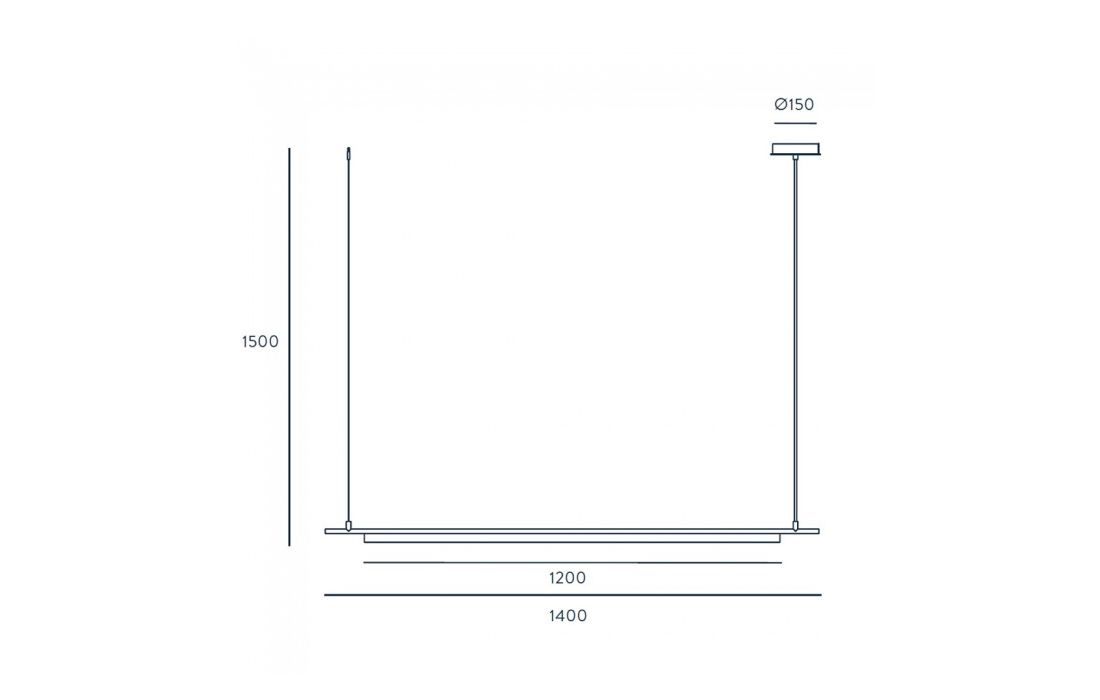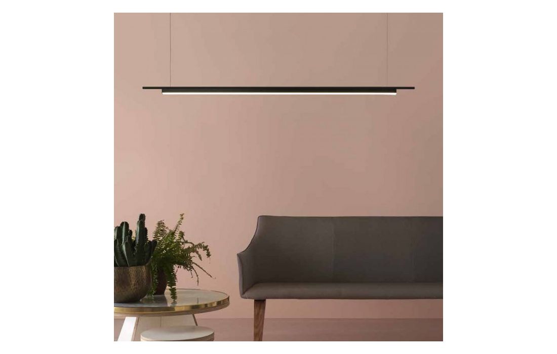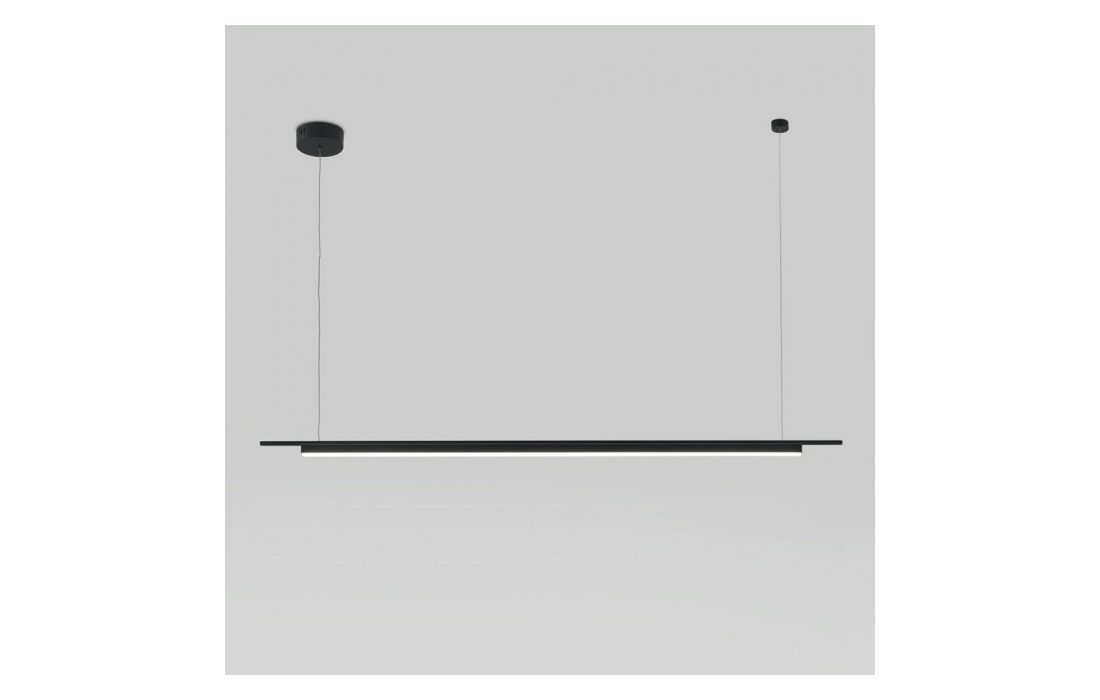 Suspended lamp with a minimalist aesthetic. A design with clean and well-defined lines, which seeks to create a welcoming atmosphere on the surface to be illuminated, with a structure in matt black painted steel and a light diffuser in white acrylic.