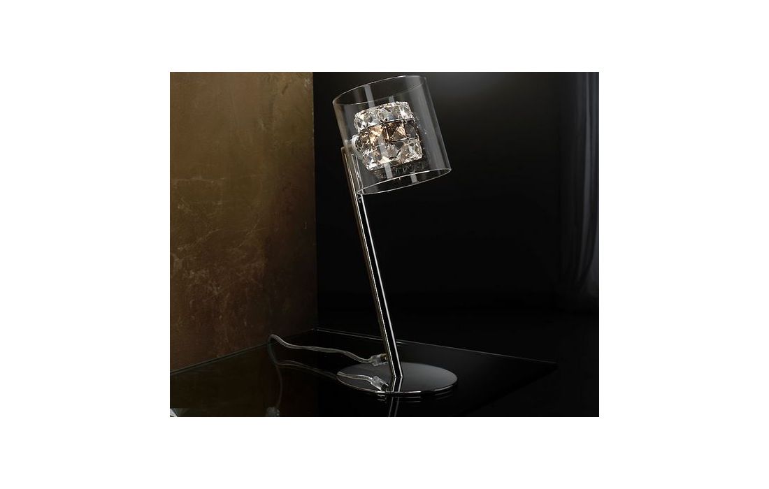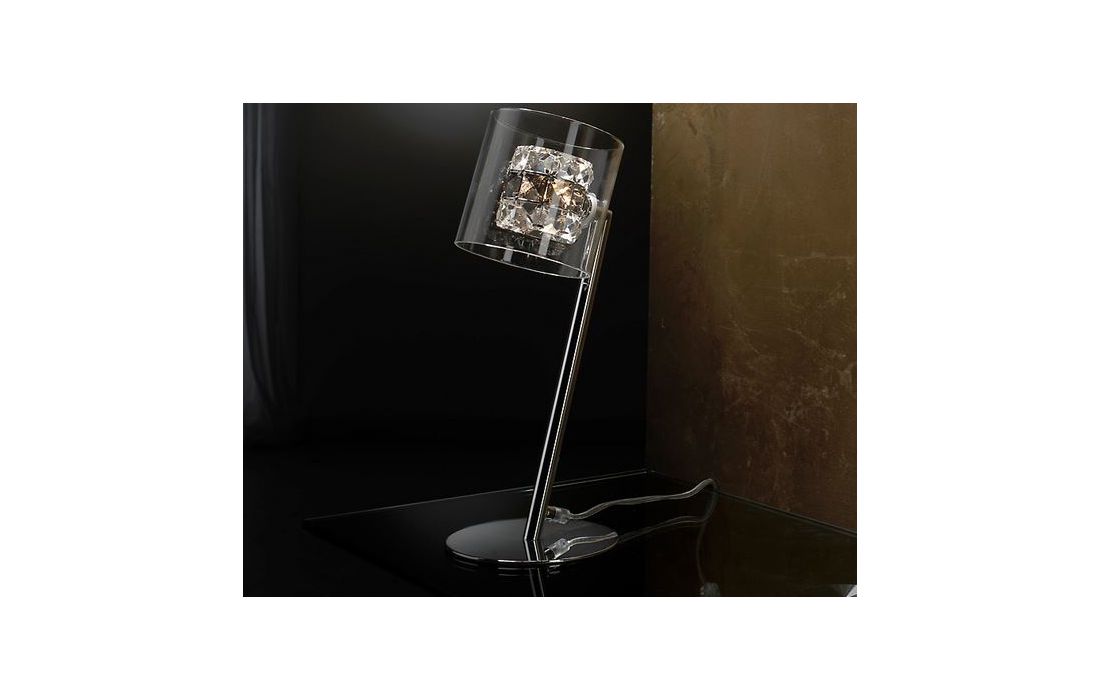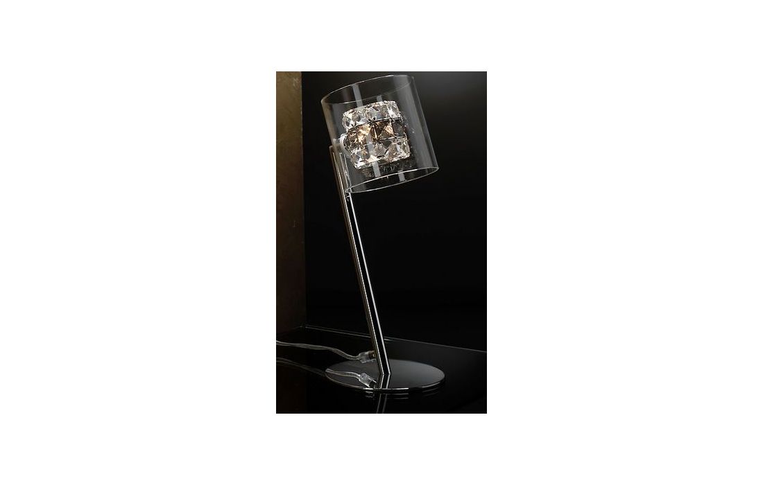 Table lamp of 1 light chrome finish metal. Double tulip on molded glass exterior and inside of transparent glass faceted copens and smoke.
