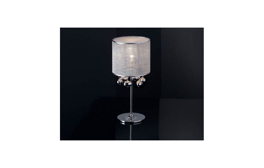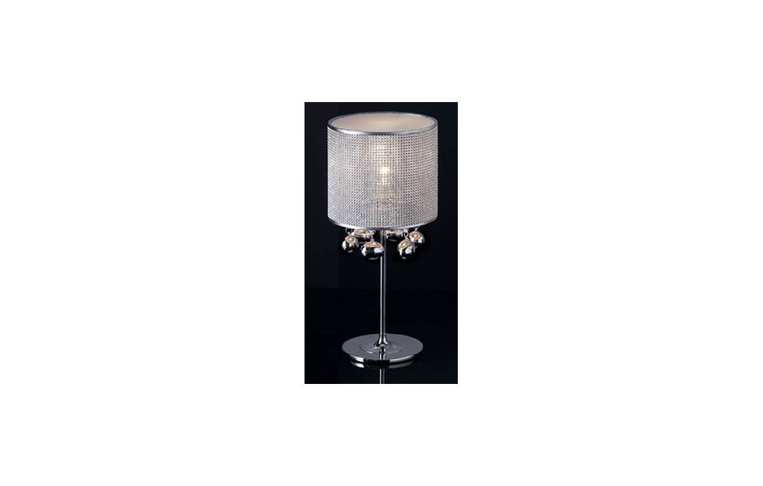 Table lamp in polished steel chrome finish. Vinyl fabric with patterned chrome fabric. Interior with faceted glass chains and chrome-plated glass bubbles.