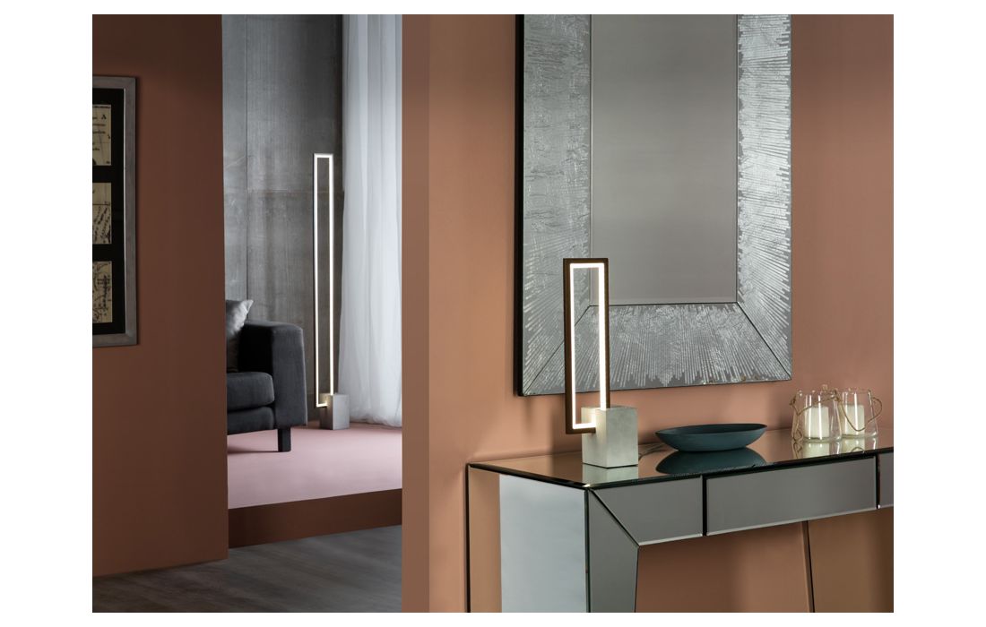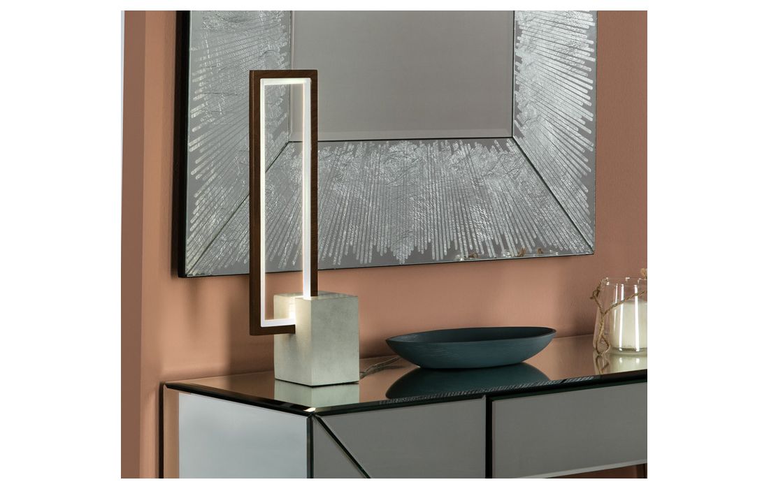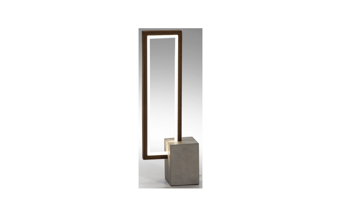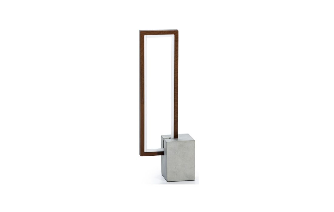 LED table lamp in acrylic, aluminum and metal. Finishing for the frame to imitate dark wood and base with imitation cement.