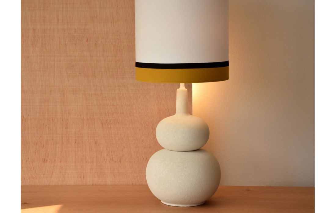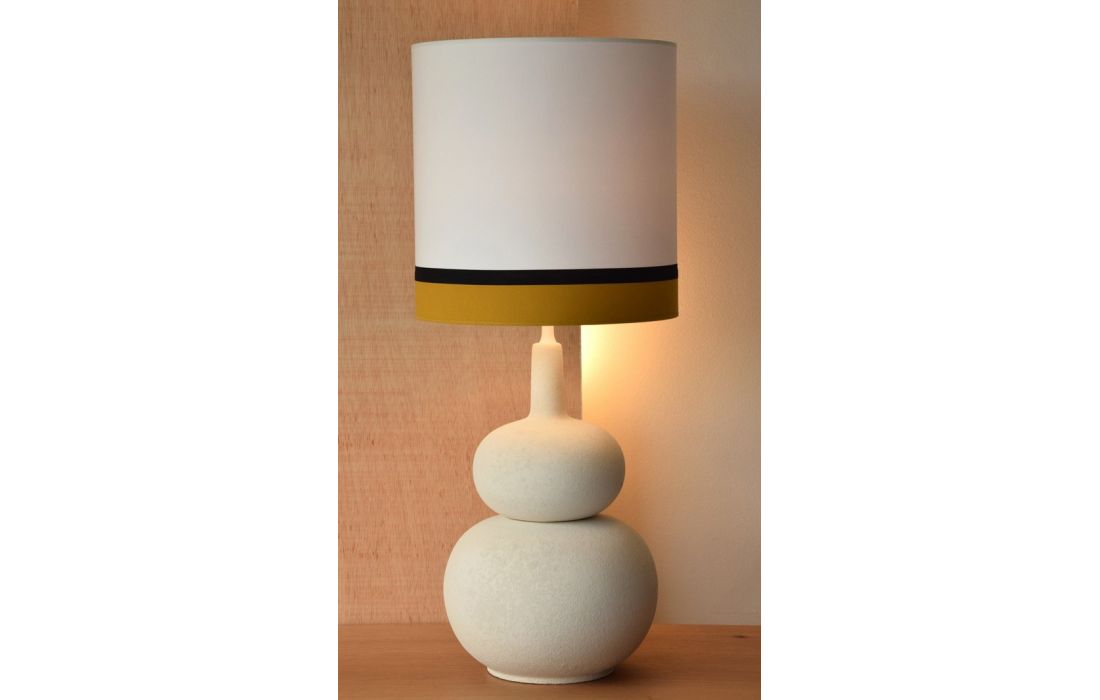 White roughly white ceramic table lamp with cylindrical white cotton lampshade and mustard 6 cm lower part