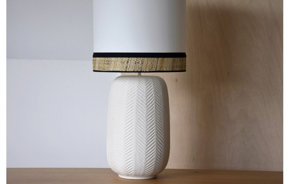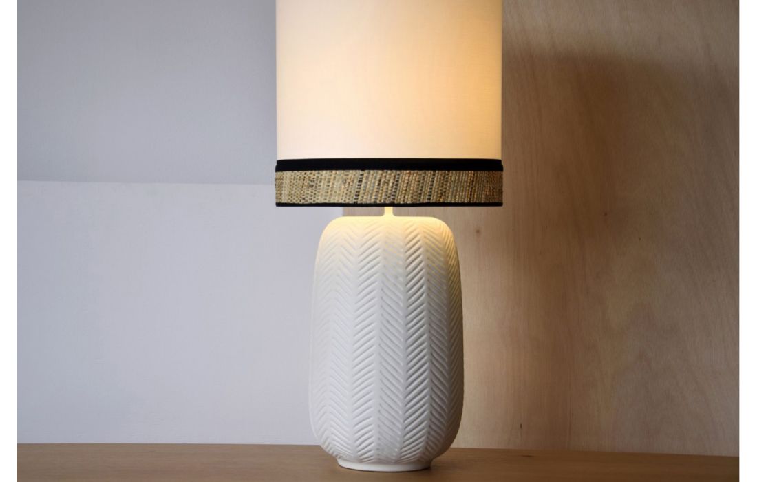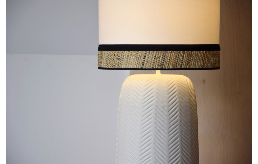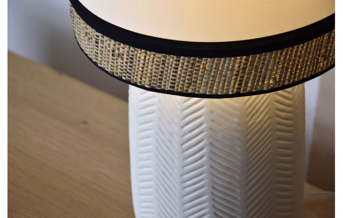 White matt ceramic table lamp with ear-shaped relief with white cotton cylindrical lampshade and 6 cm lower part in natural raffia