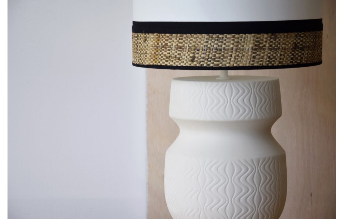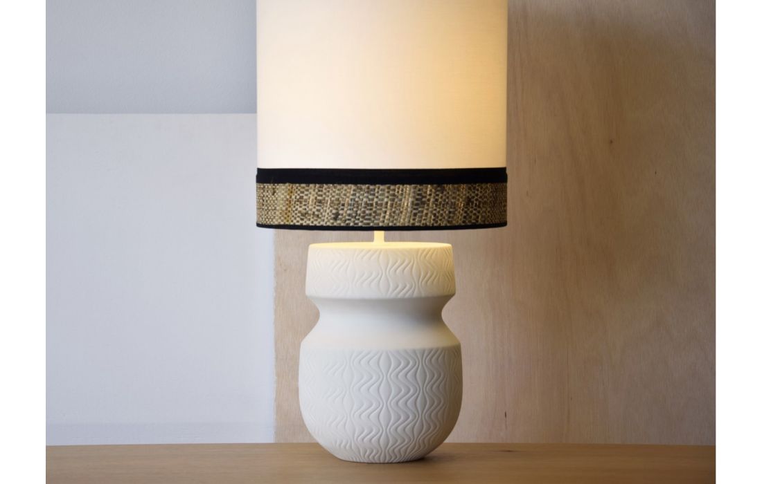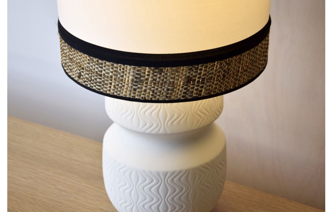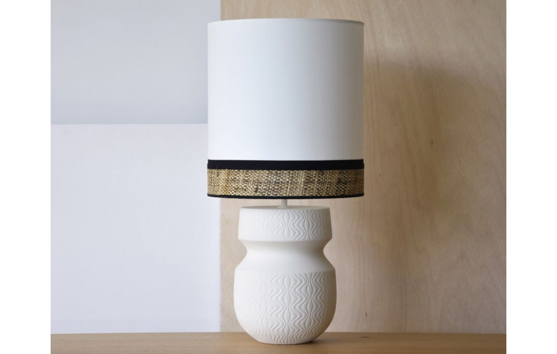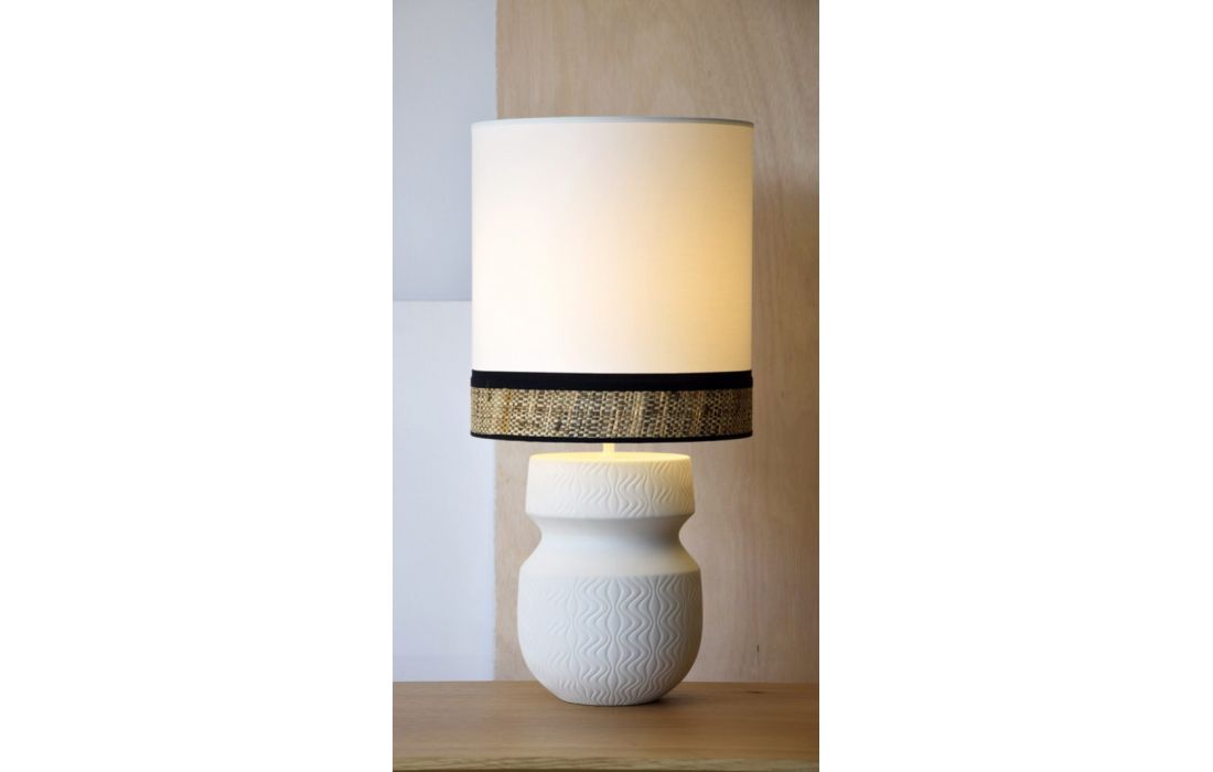 White ceramic table lamp natural finish with white cotton cylindrical lampshade and 6 cm lower part in natural raffia