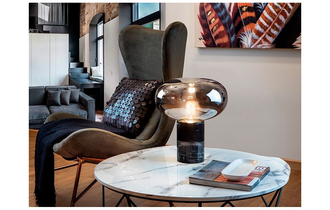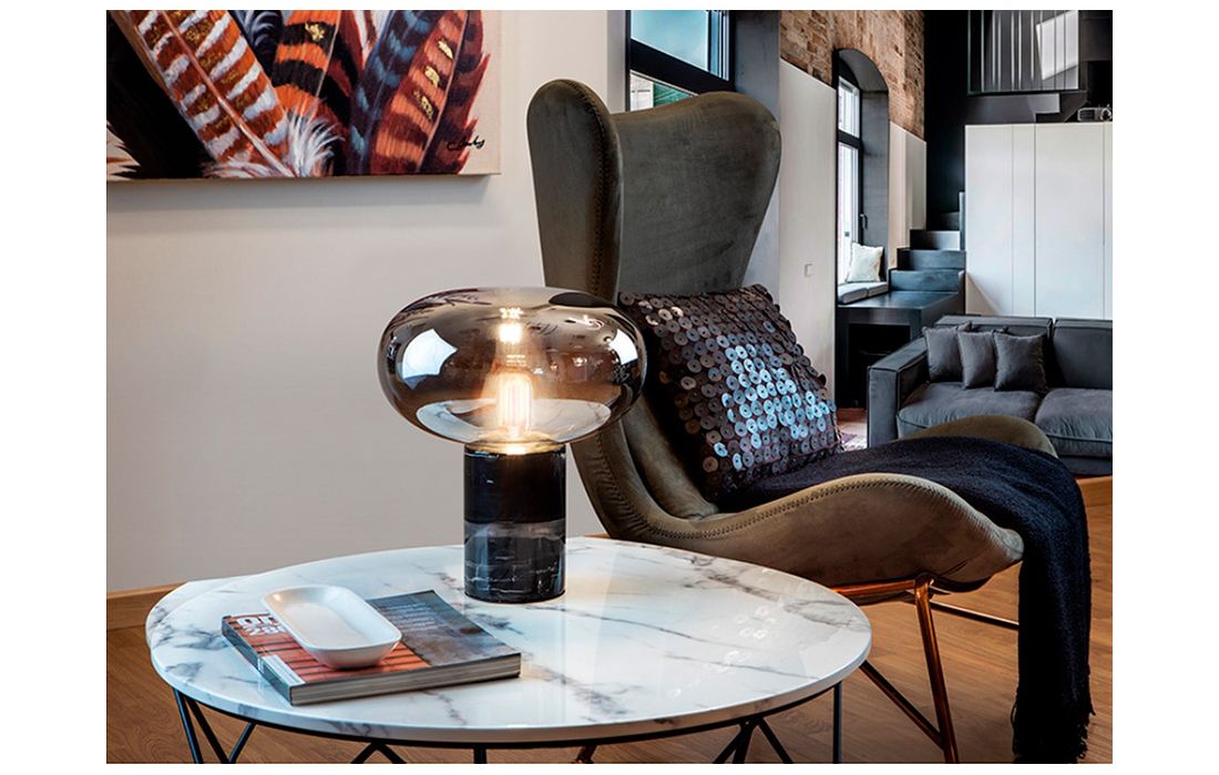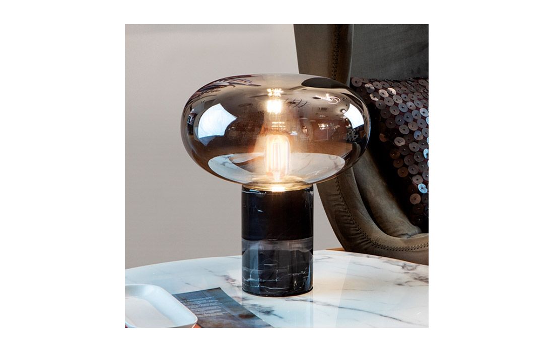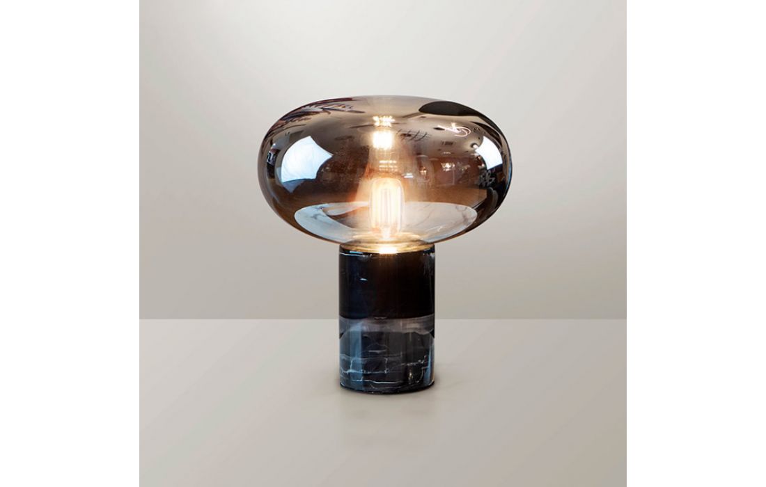 Table lamp with 1 light. Made in black marble. Blown glass lampshade, mirrored smoke color.Dimensions in cm