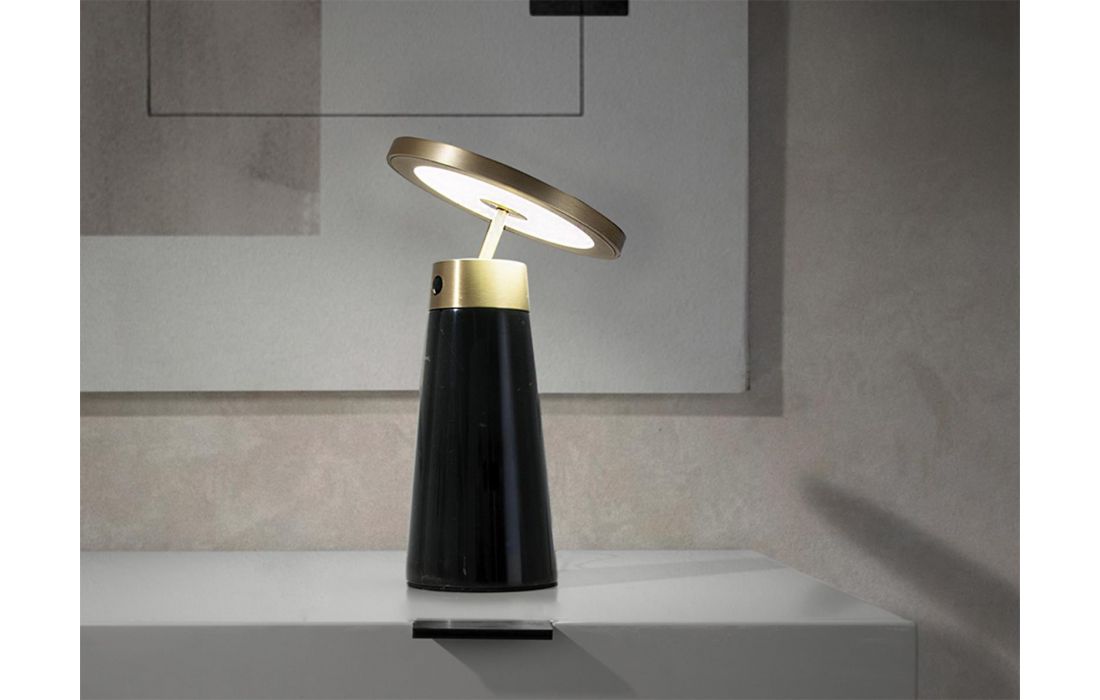 Table lamp with body in similar nero marquina porcelain and directional disc in polished golden steel. It has an adjustable dimmer in intensity and color