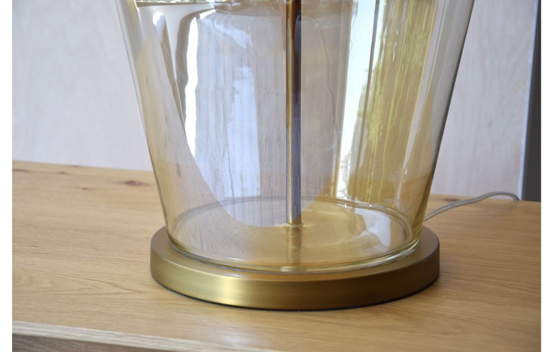Table lamp made of clear amber glass with metal base with matt aged gold finish