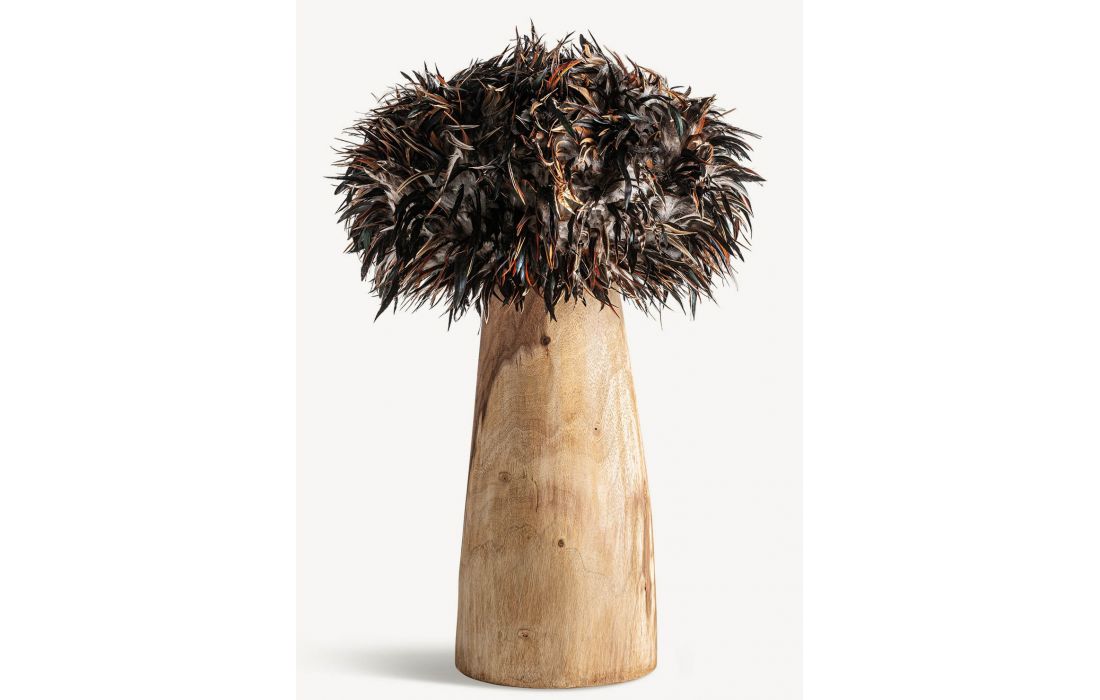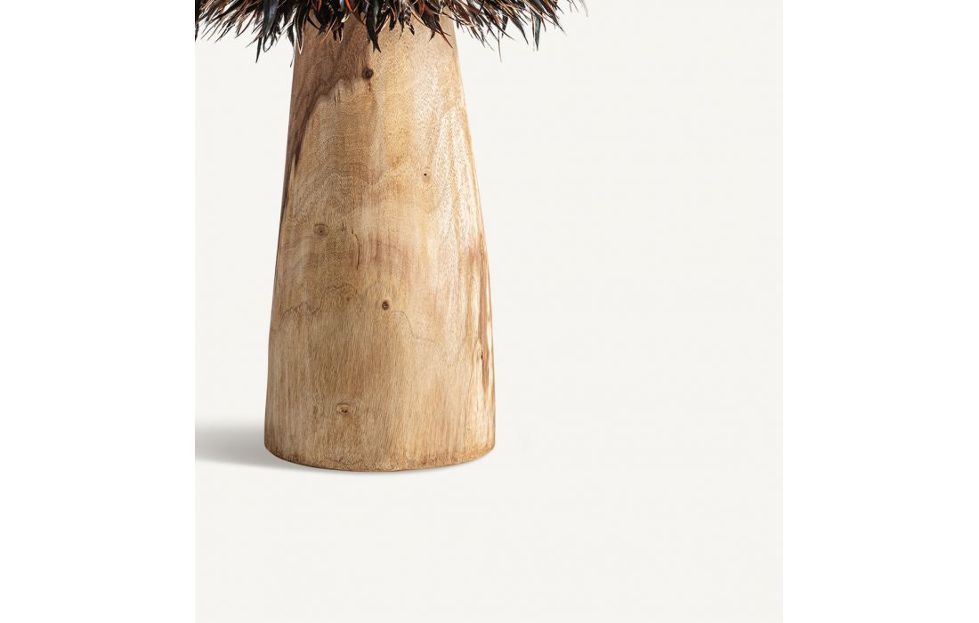 Ethnic style table lamp made of natural colored teak wood and feathers. Liftable product
