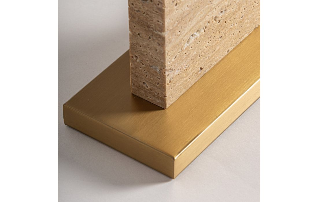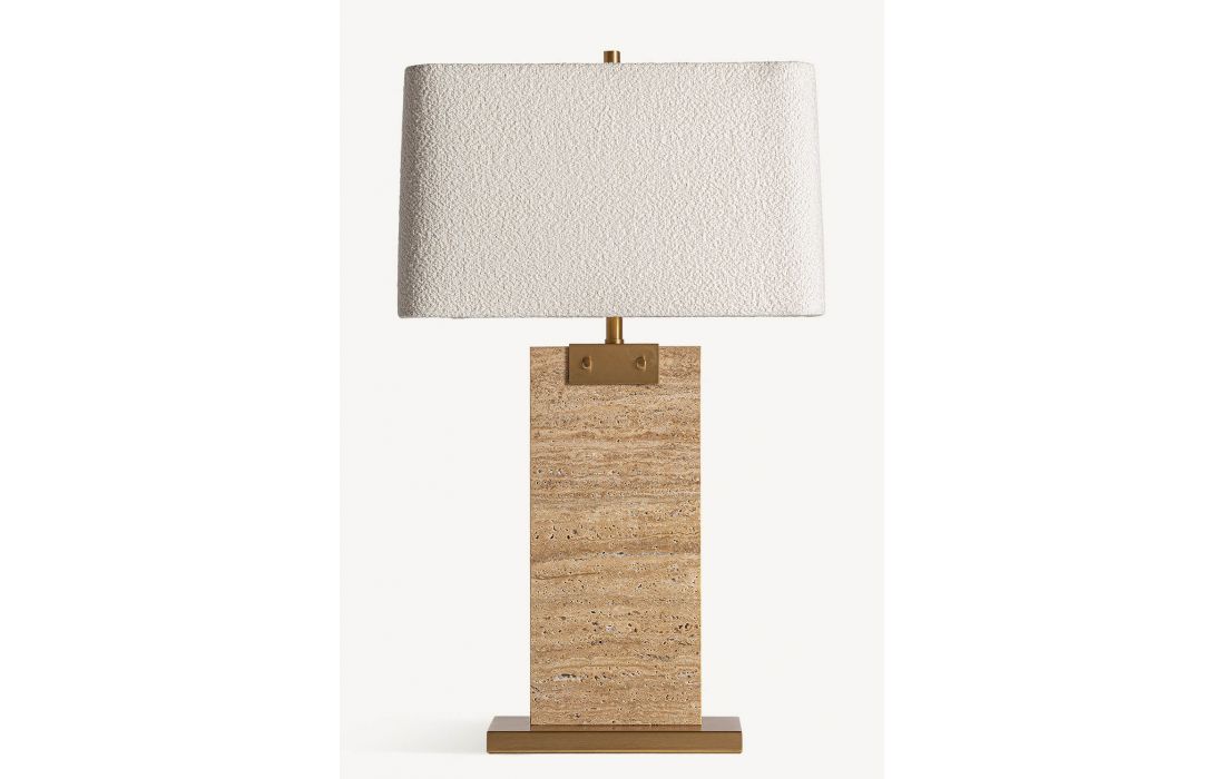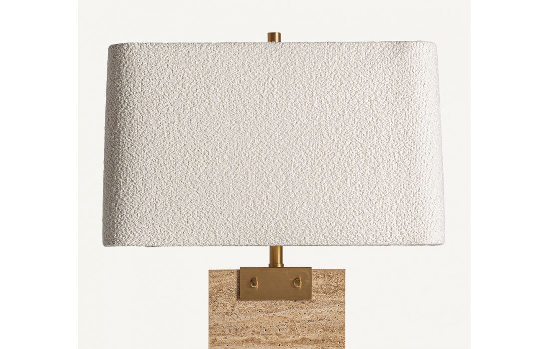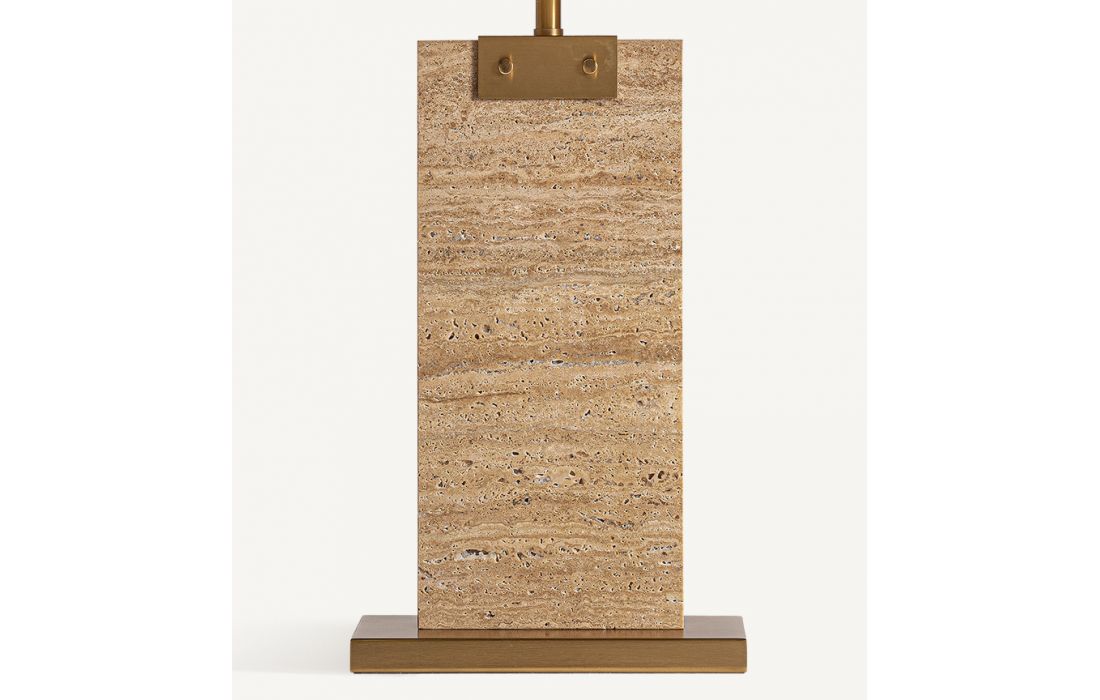 Art deco style table lamp made of iron and travertine with cotton fabric shade
