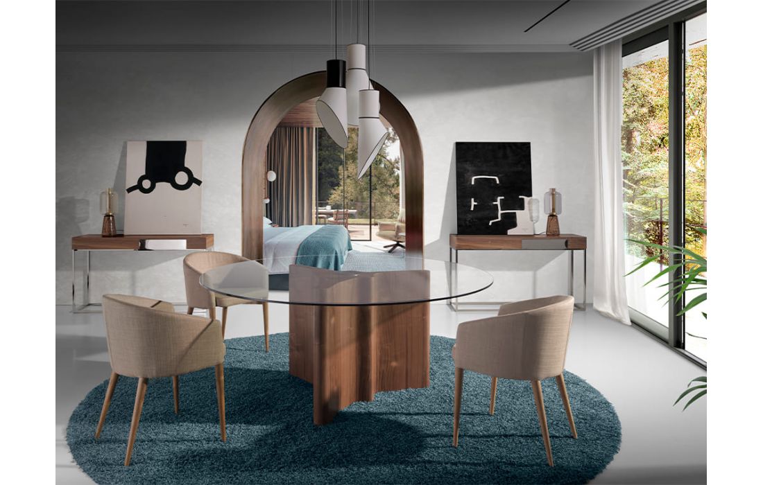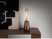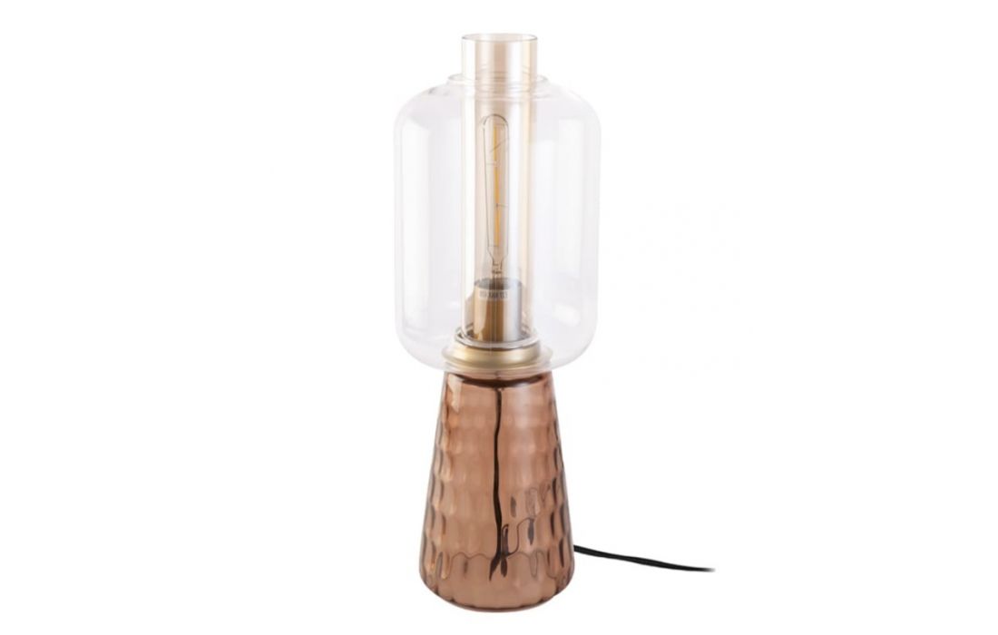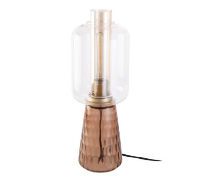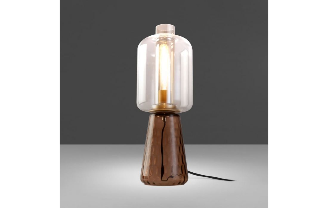 Table lamp in clear and smoked glass. Base in brown smoked glass with decorative relief. Transparent top hood and internal amber lamp protection.