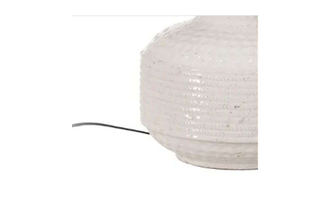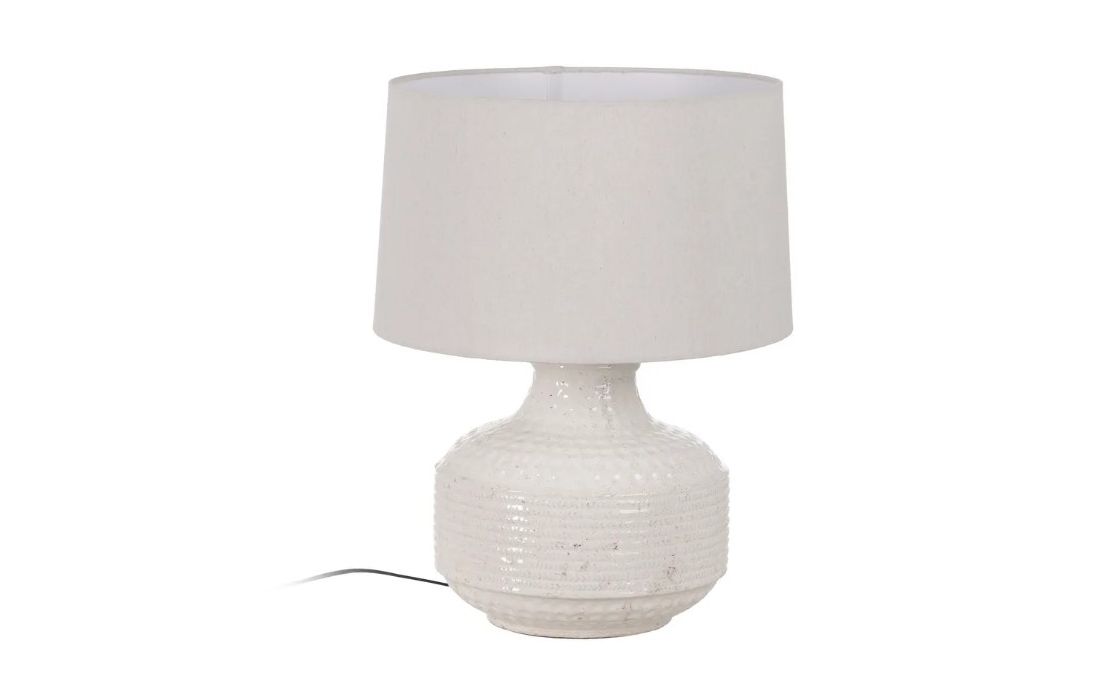 Lampshade with ceramic base and linen fabric shade.