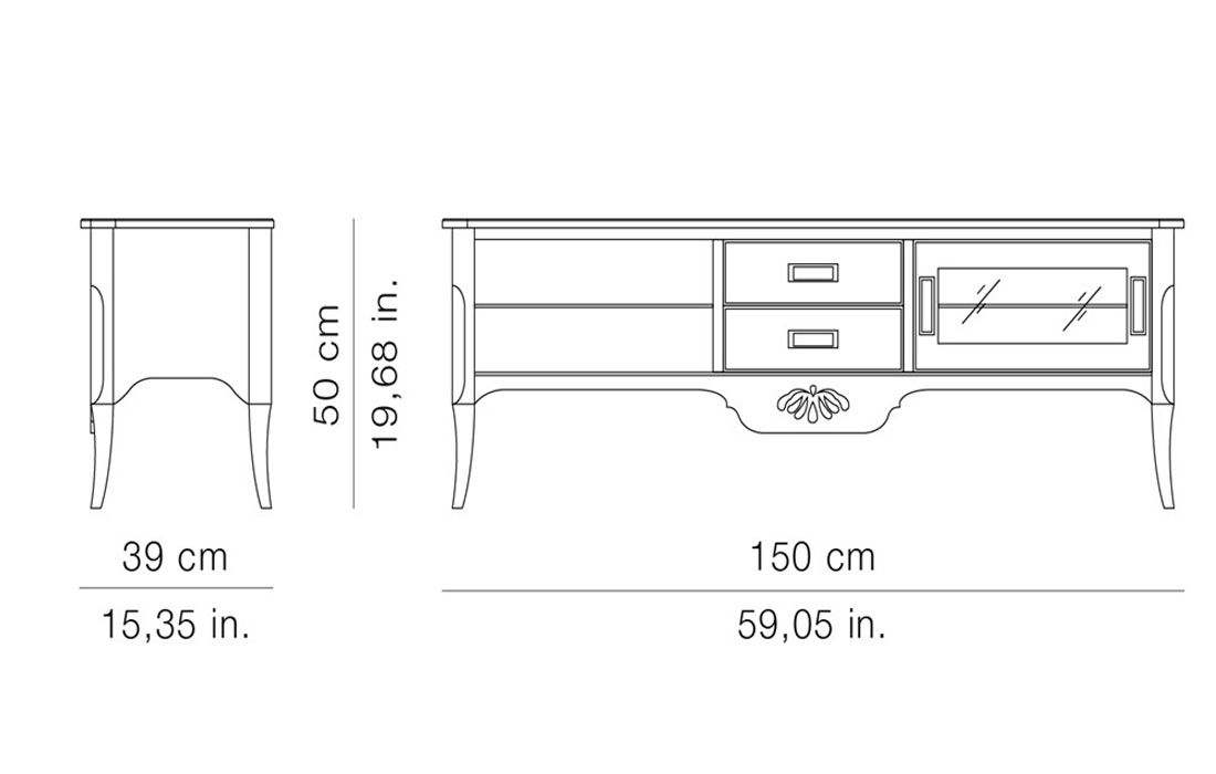 | P - 05 | 1 | Base TV w / 2 drawers and 1 sliding door | L 150 D 39 H 50 | 1.410,00 € | ||||