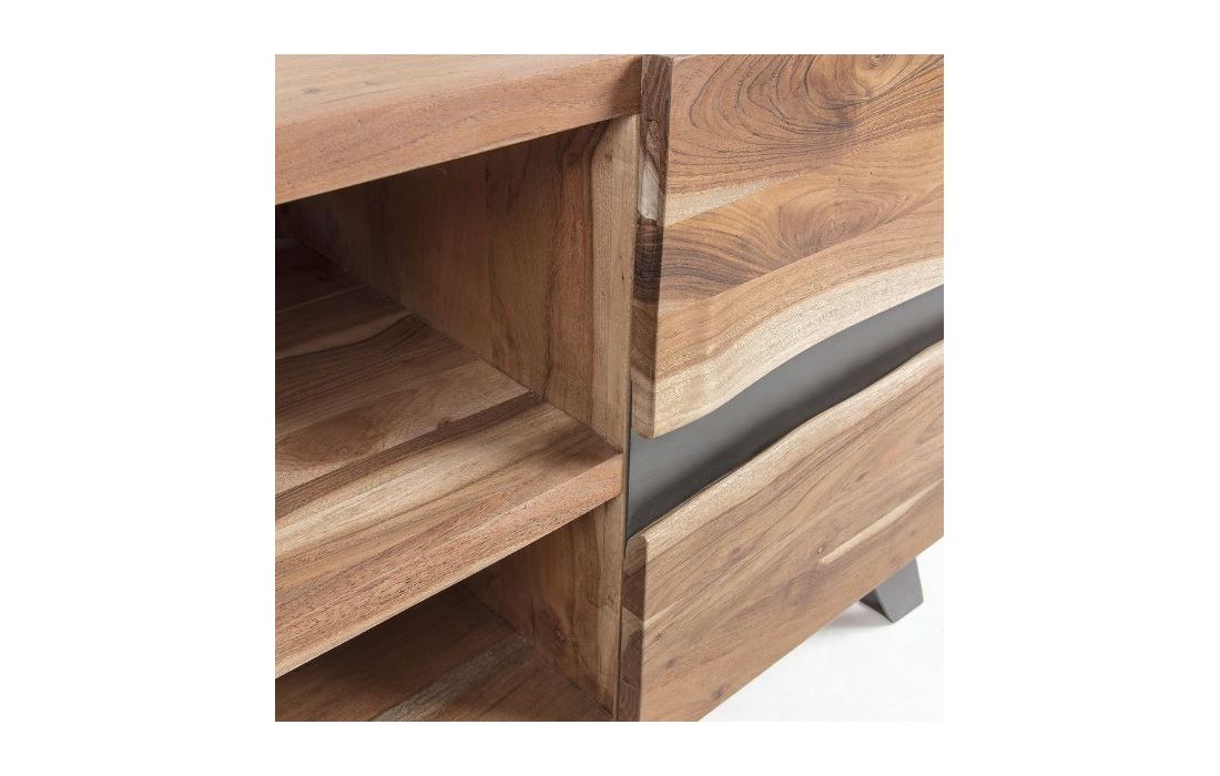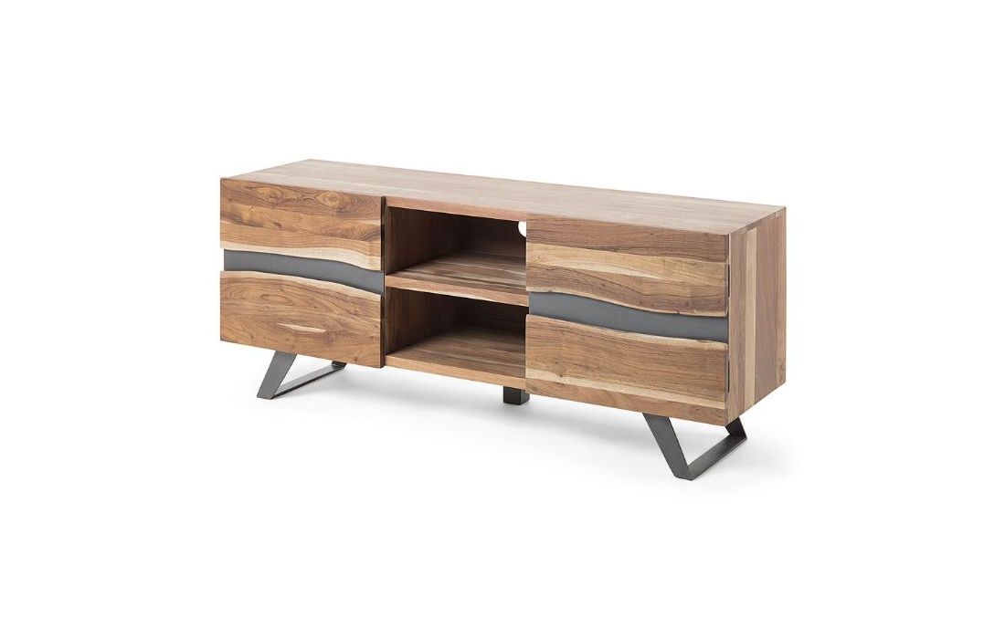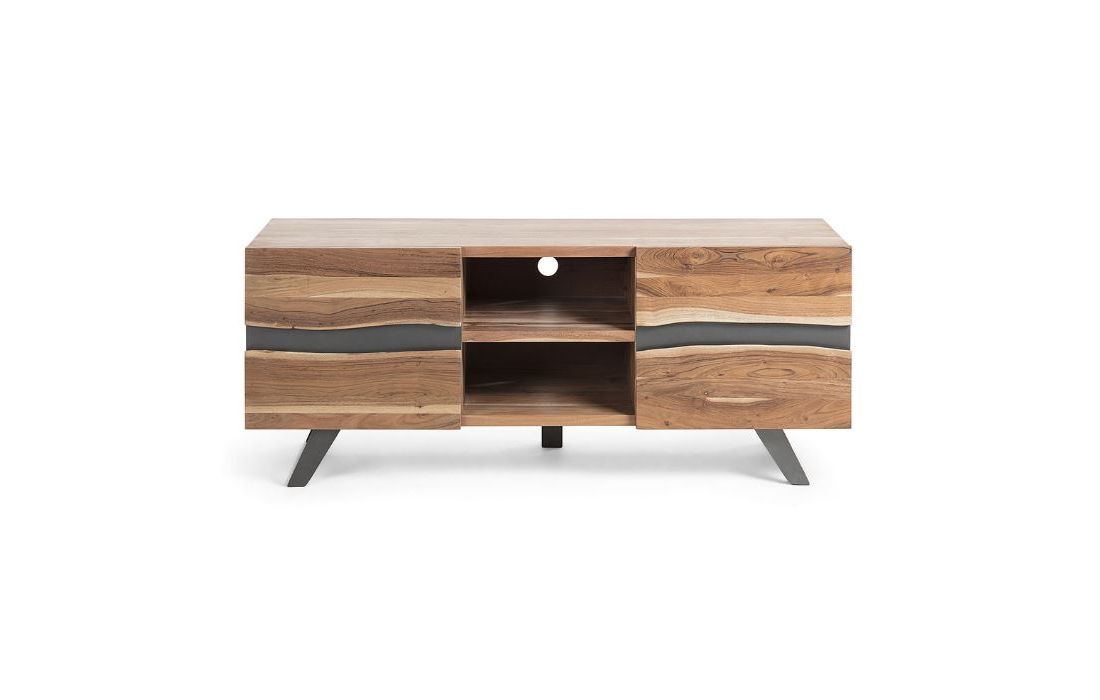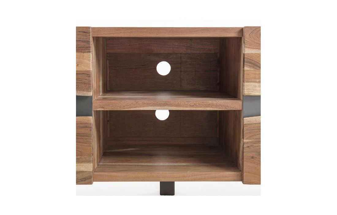 Base tv with 2 doors and open in the middle in acacia wood, with feet and detail of metal doors.