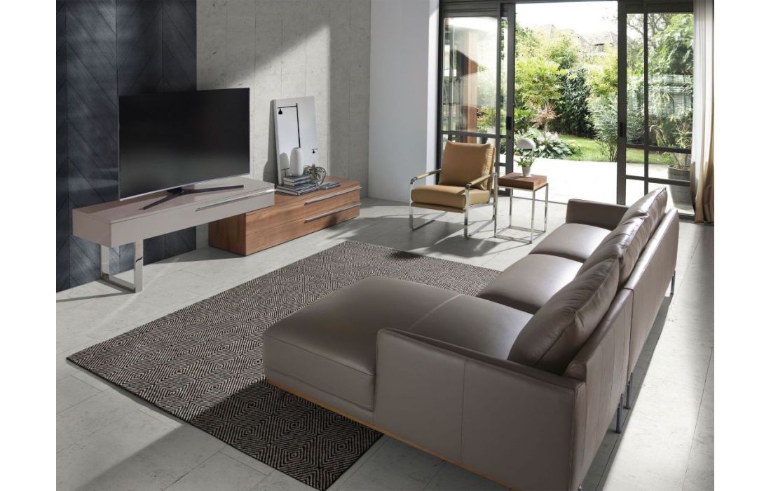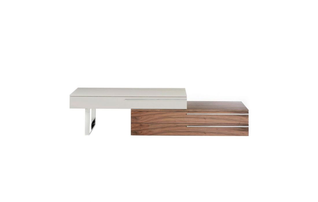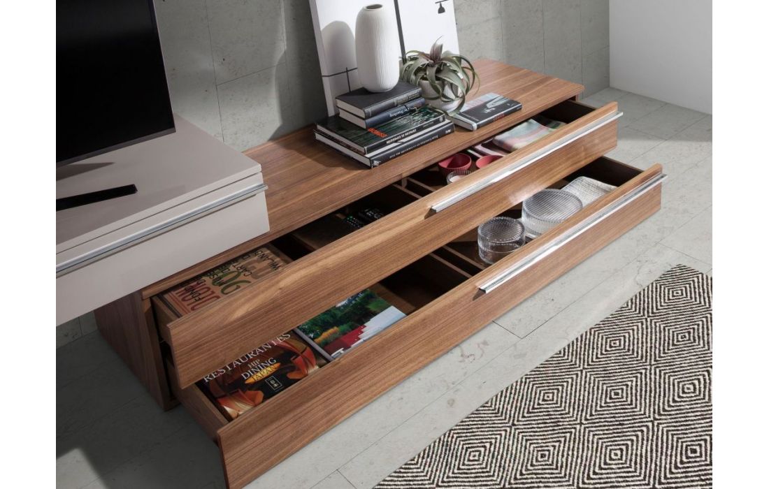 Modern design TV stand with natural walnut MDF structure and stainless steel legs with beige MDF detail, with 3 drawersRecipient :