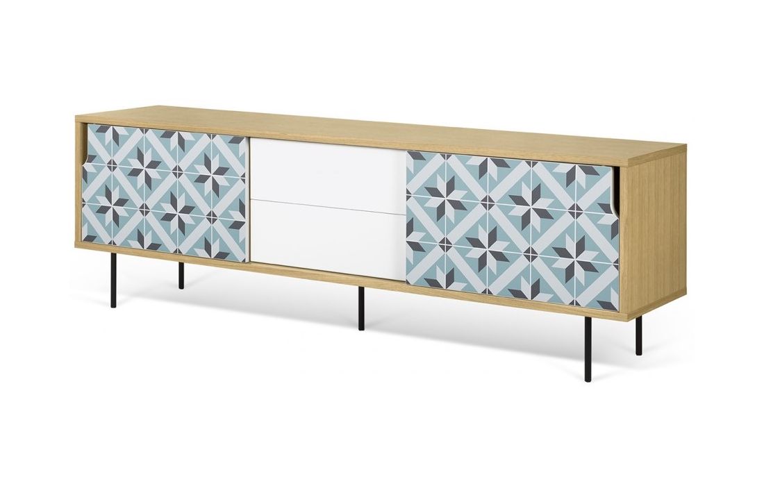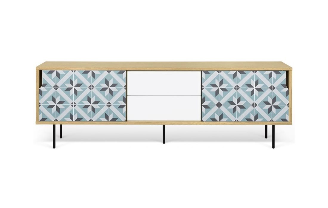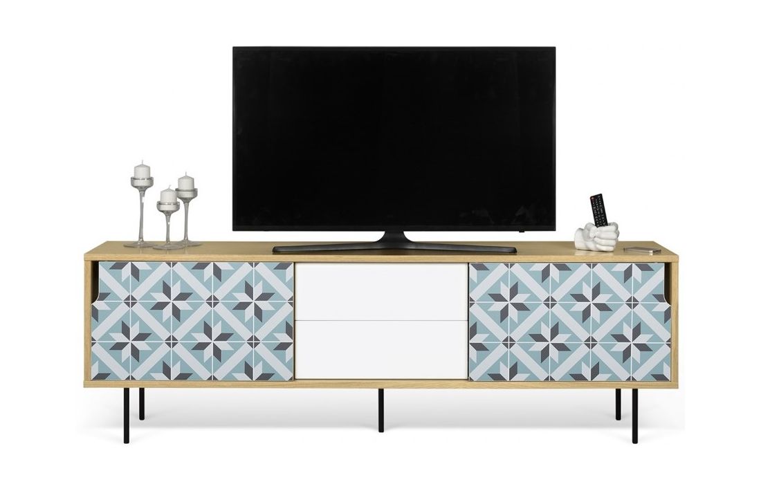 TV base with differentiating details, such as the geometric pattern on the doors.