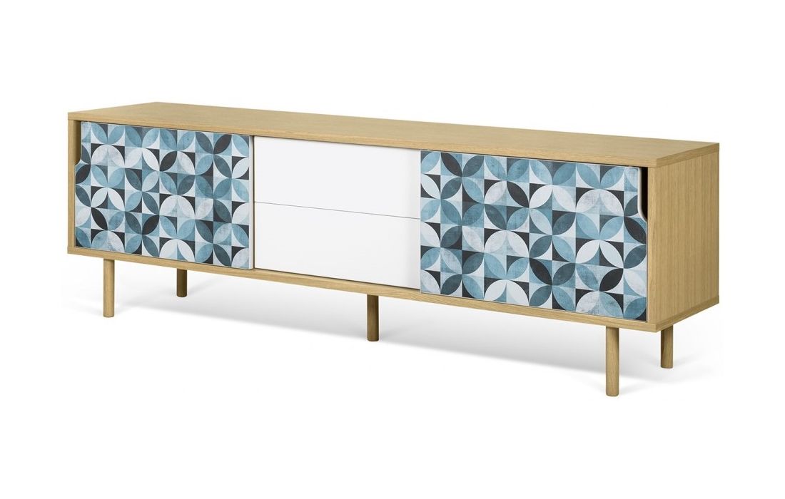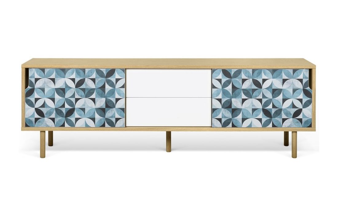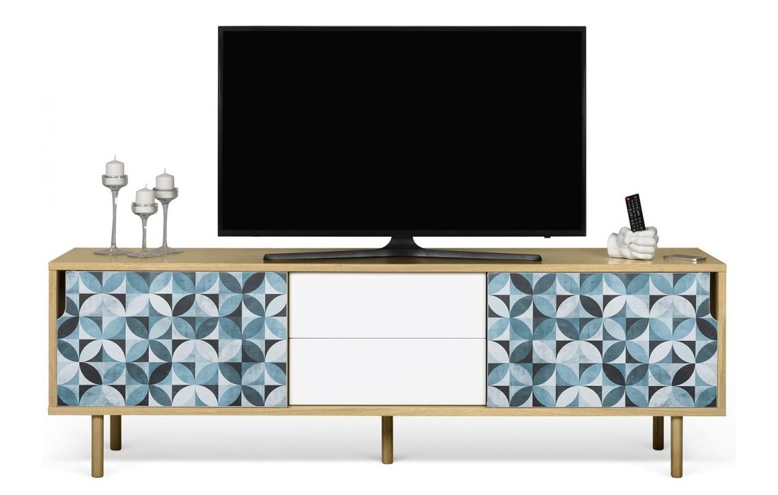 TV base with differentiating details, such as the geometric pattern on the doors.