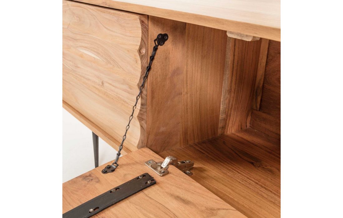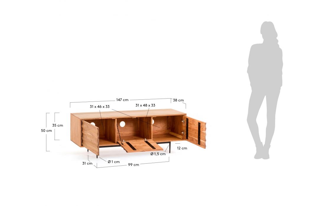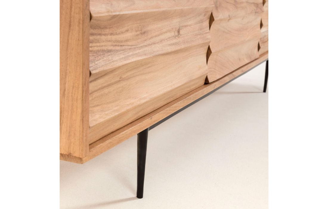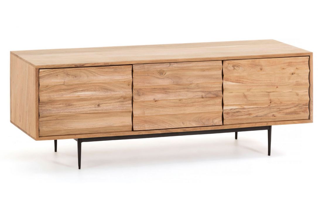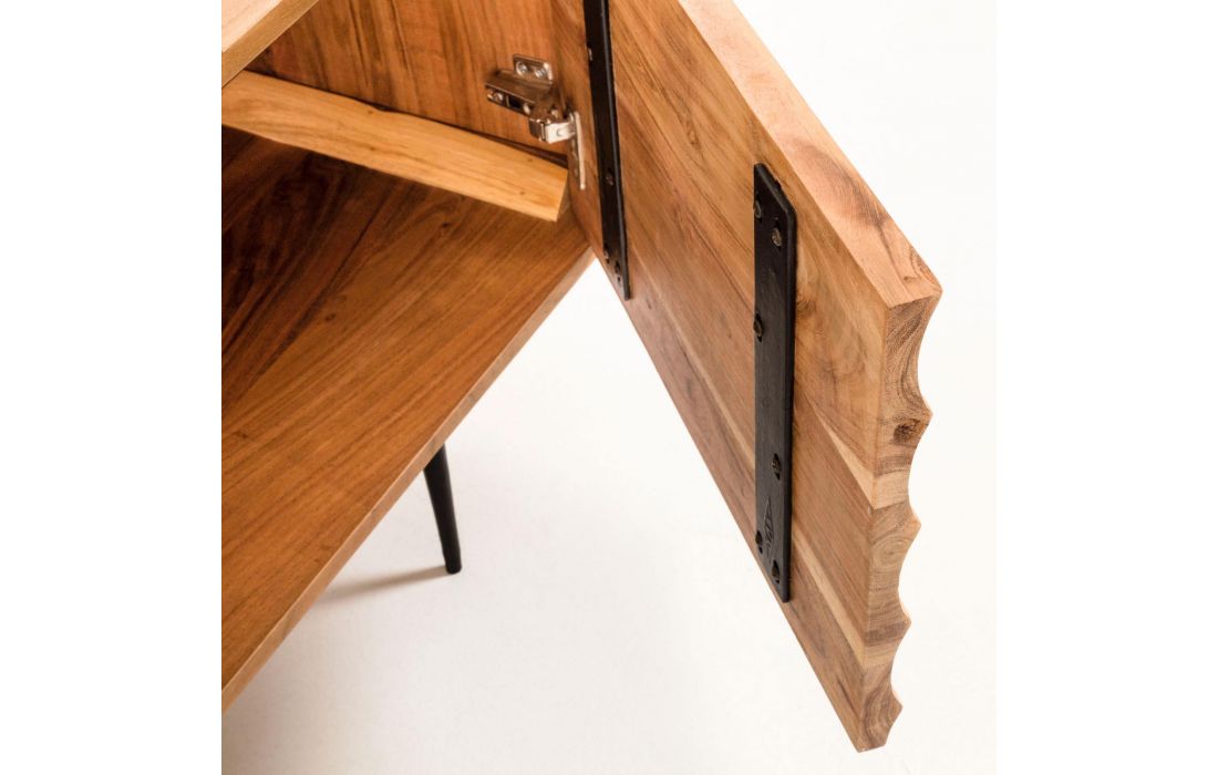 TV base with black metal feet and solid natural acacia wood structure with sliding door in the middle.