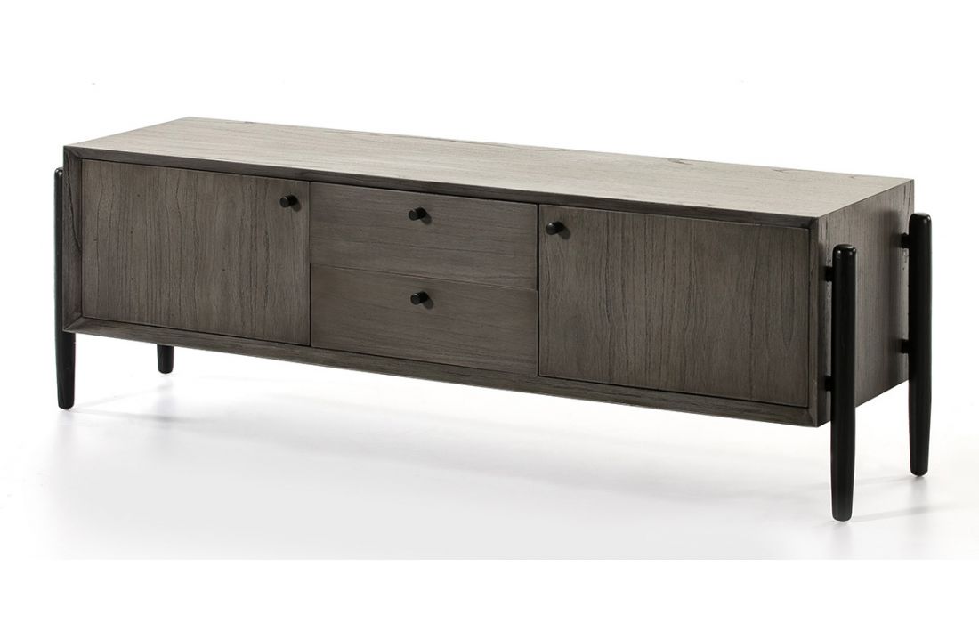 TV base with 2 doors and 2 drawers in gray/black painted wood.