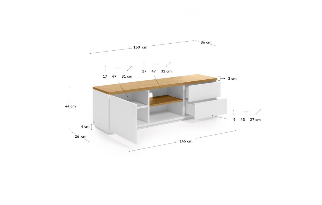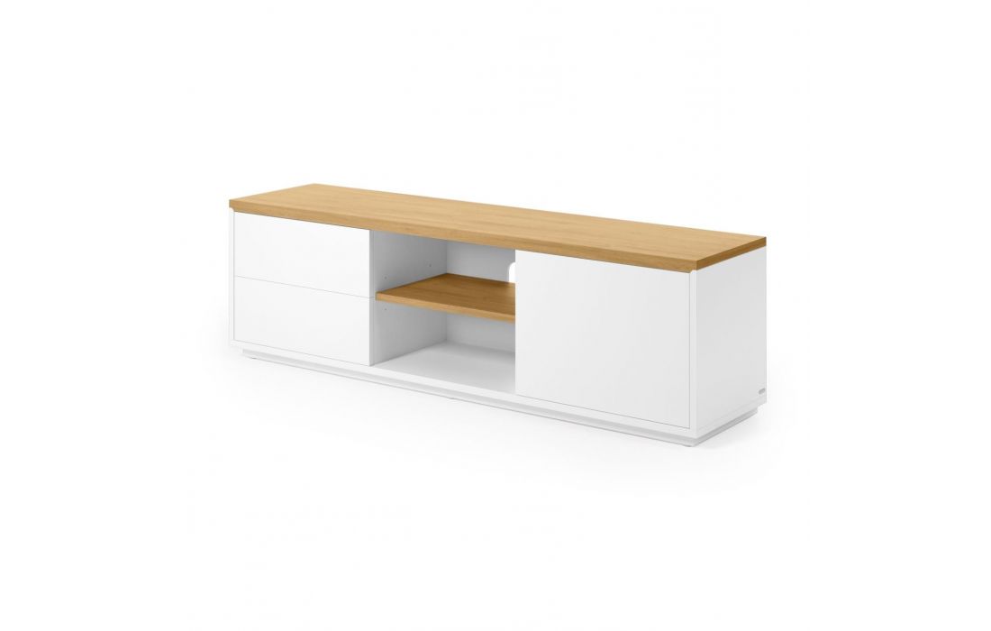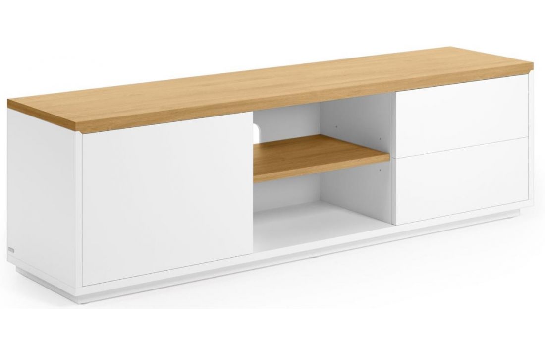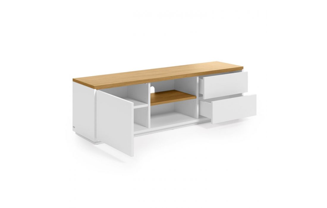TV BASE WITH OAK TOP AND SHELF PLATED WITH OAK AND DOORS AND DRAWERS WHITE LACQUERED