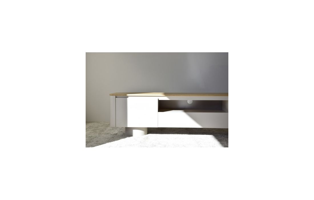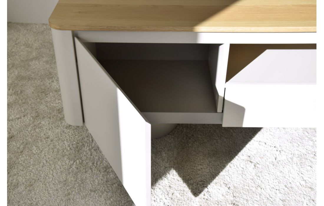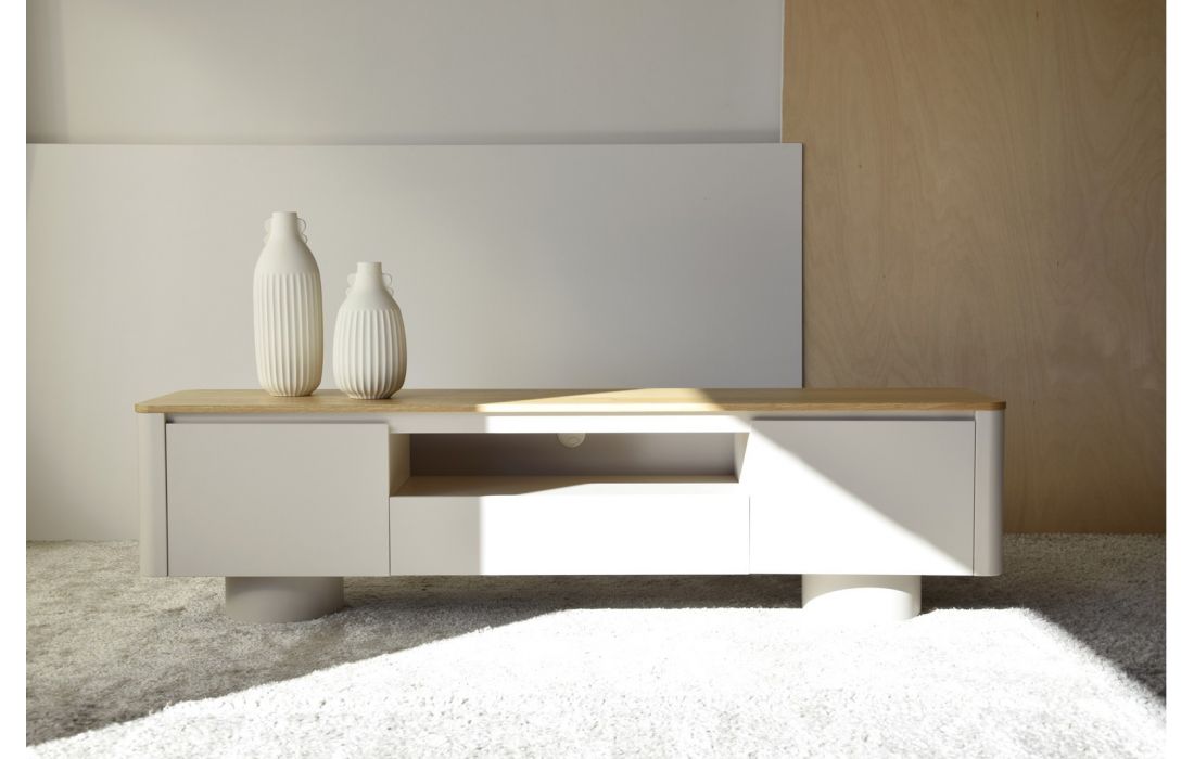 Lacquered Mdf in matte light gray tone and natural oak wood top.