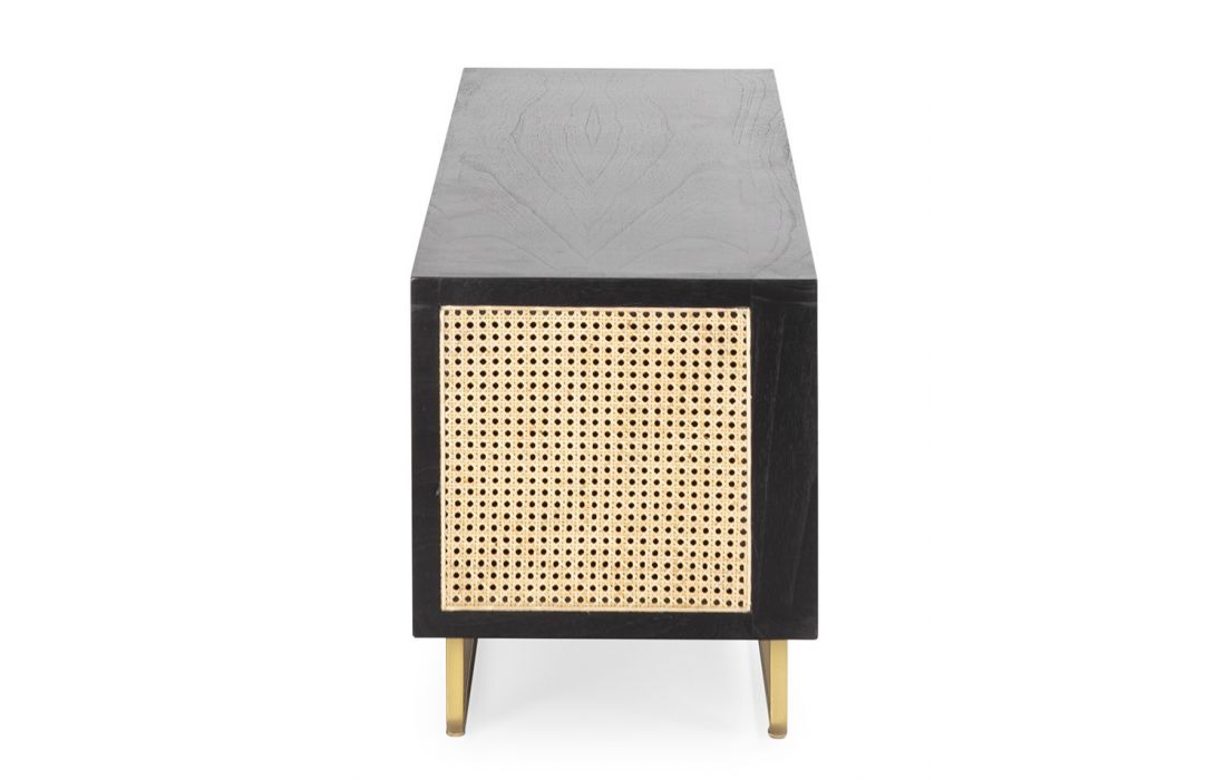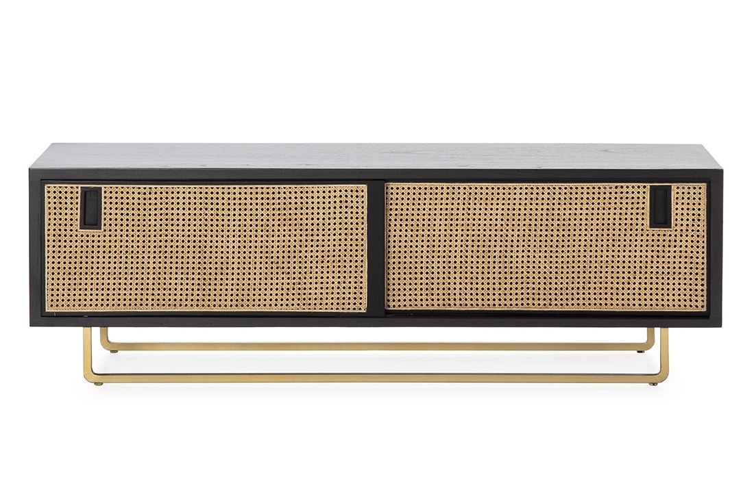 TV base with 2 sliding doors in wood and ratan, base in golden metal