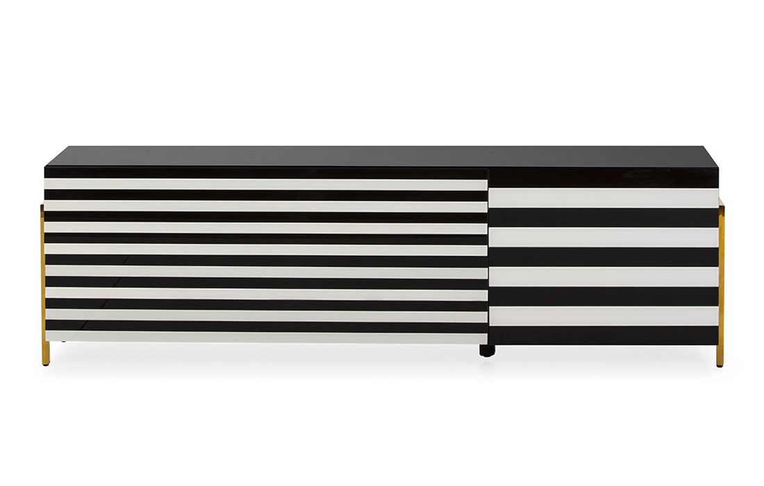 TV base with 2 drawers and 1 door in black/white glass and gold colored steel