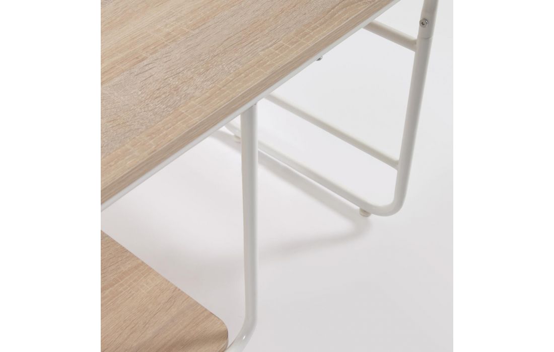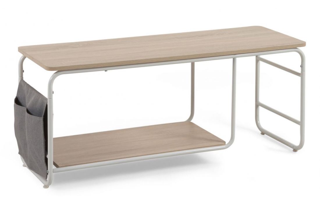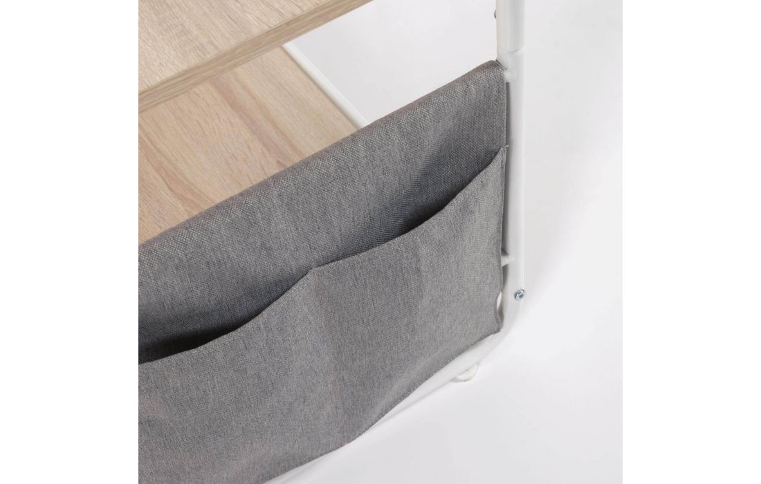 TV base with white steel structure, melamine tops and fabric bag for accessories