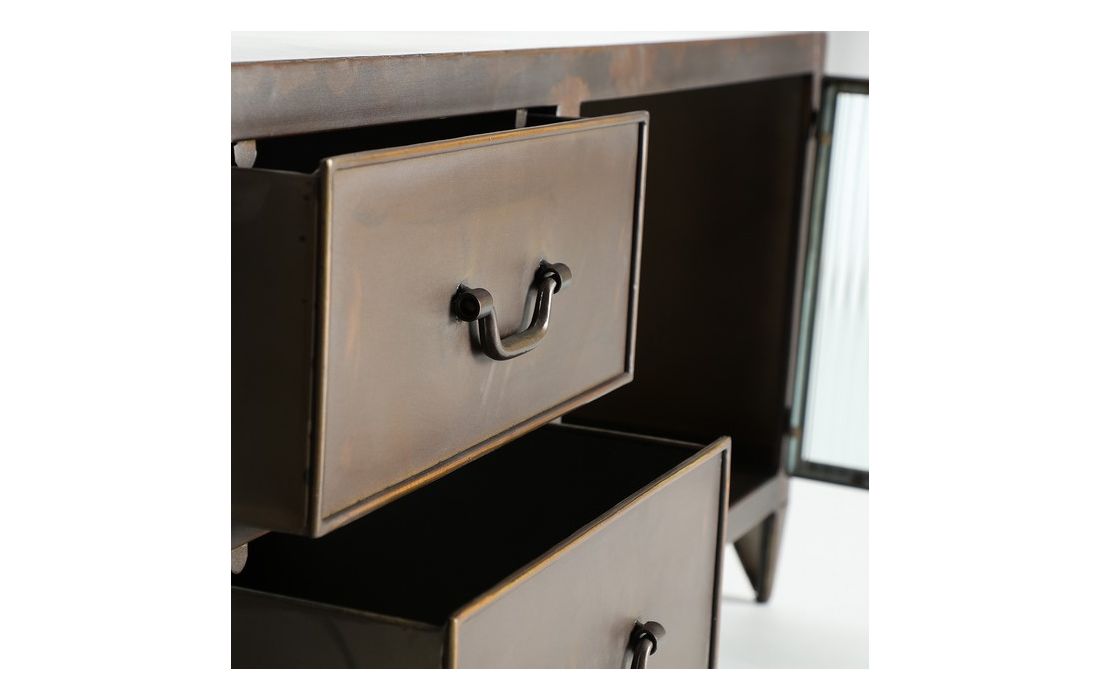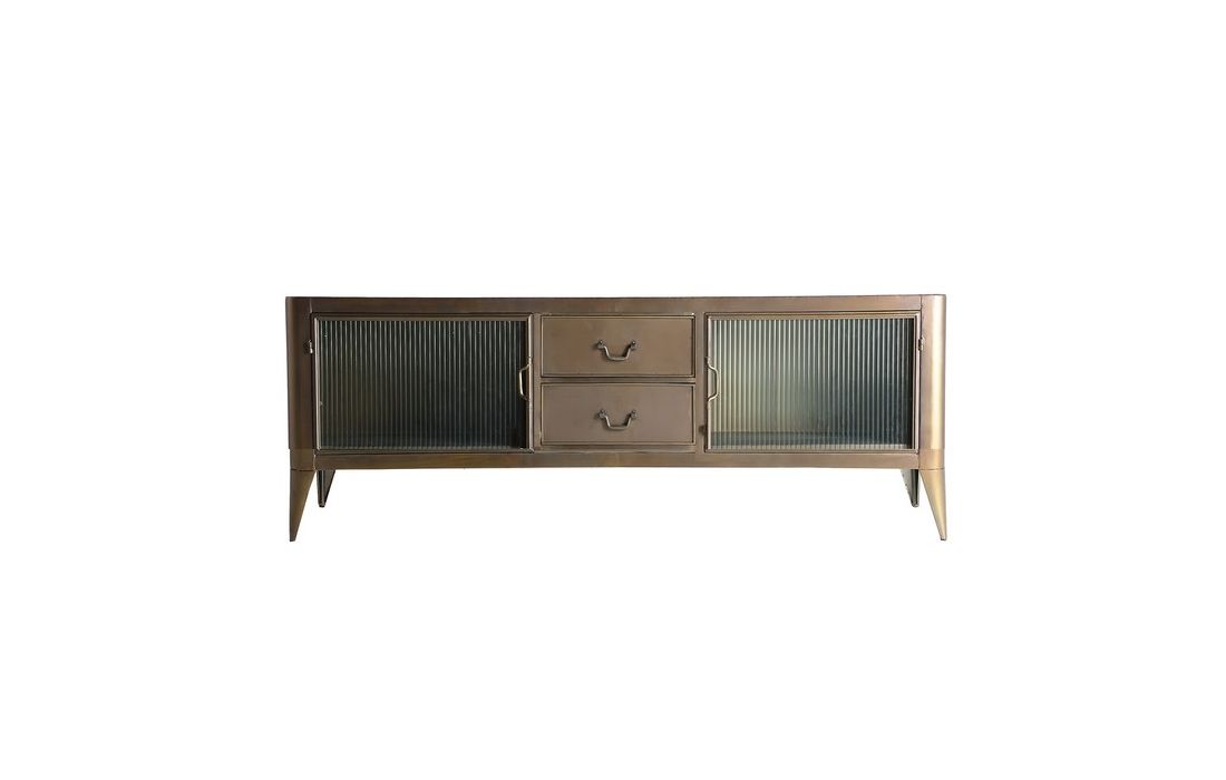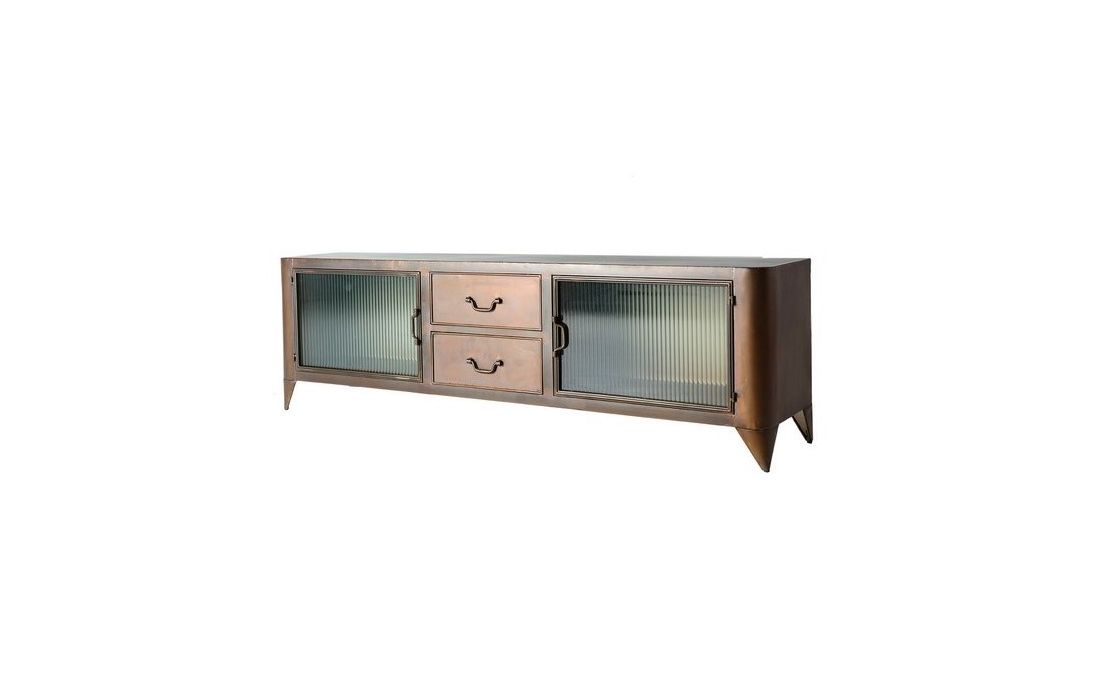 TV base made with a metallic structure made entirely of iron with two opaque and wavy glass doors.