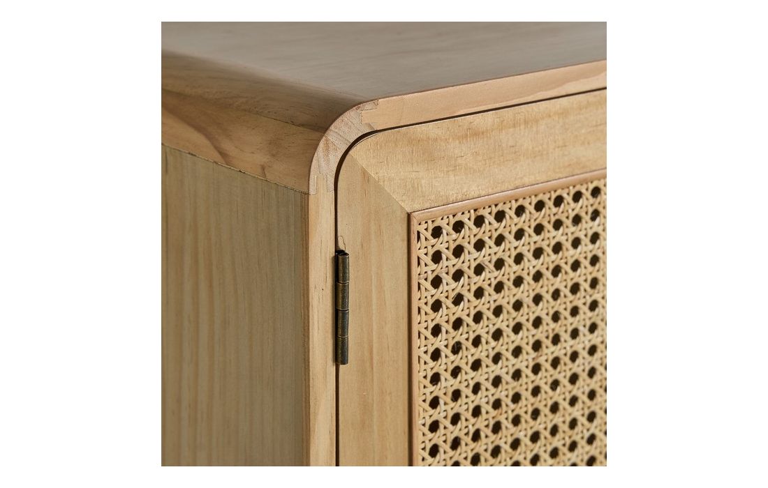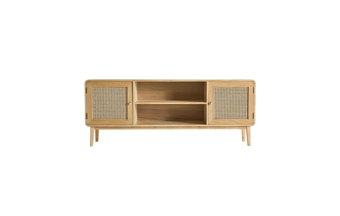 TV base made of pine wood combined with MDF, with two straw side doors and two holes in the central part.