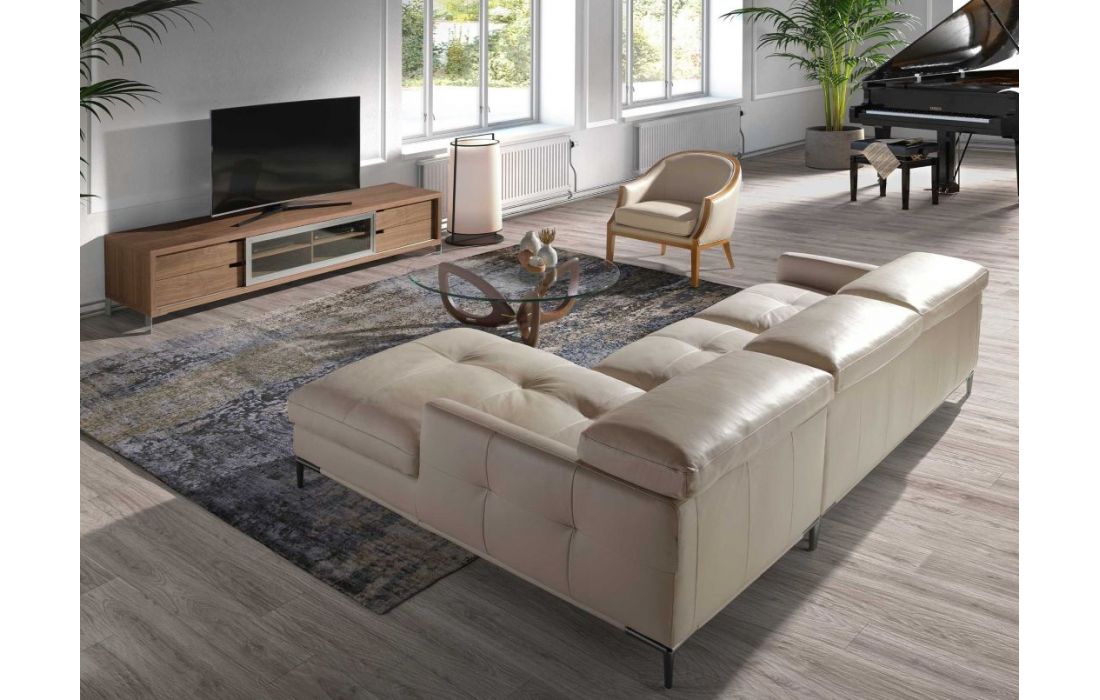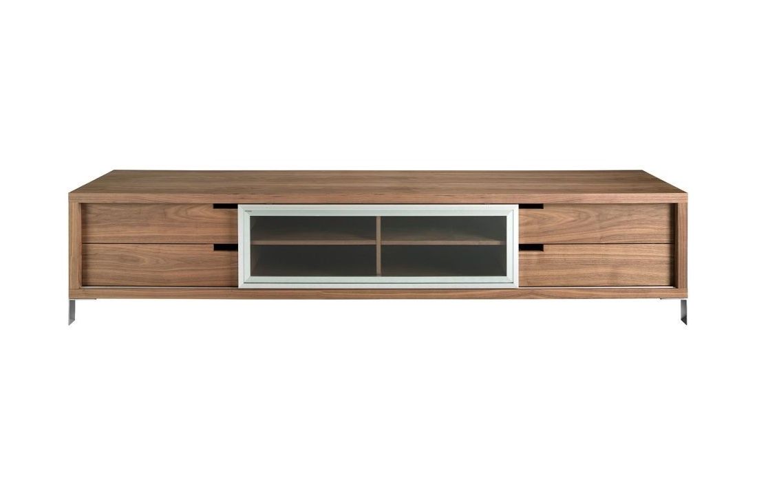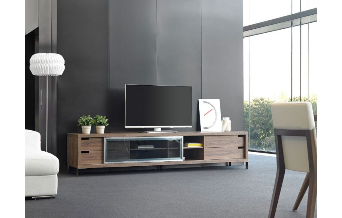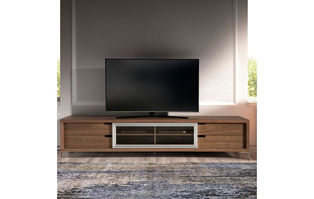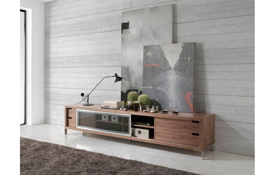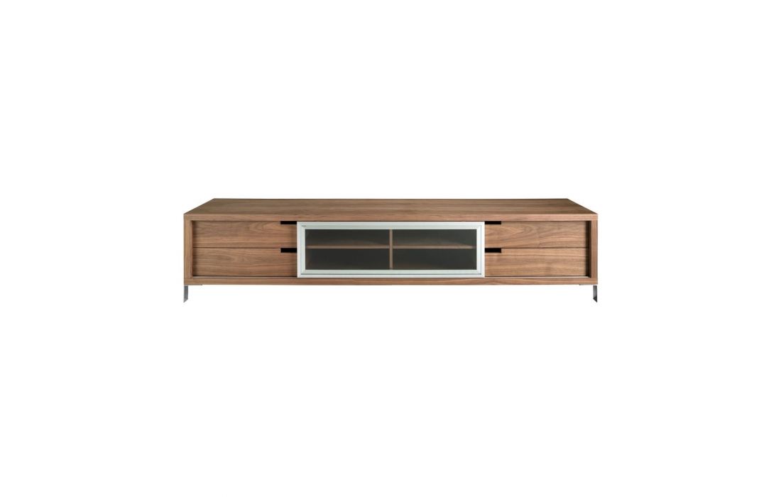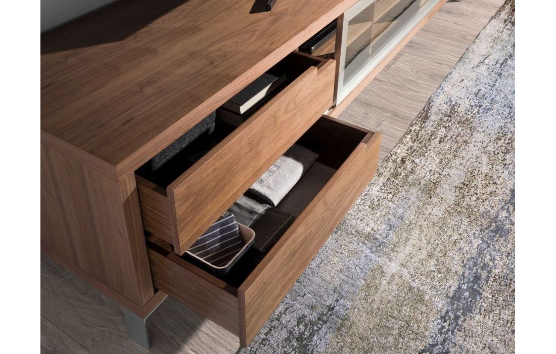 Modern design TV stand with MDF structure in natural walnut and original stainless steel legs, tempered glass detail, with 4 drawers and 1 doorRecipient :