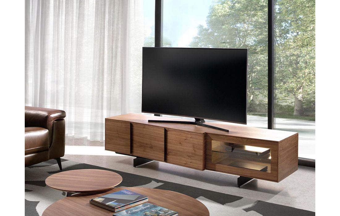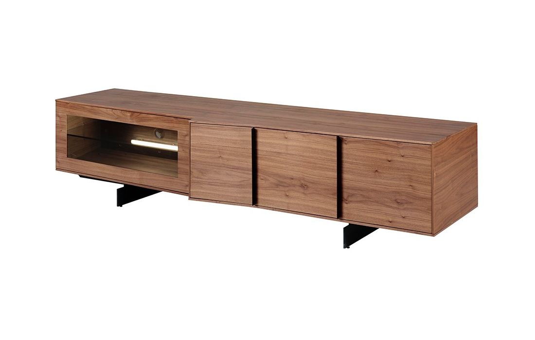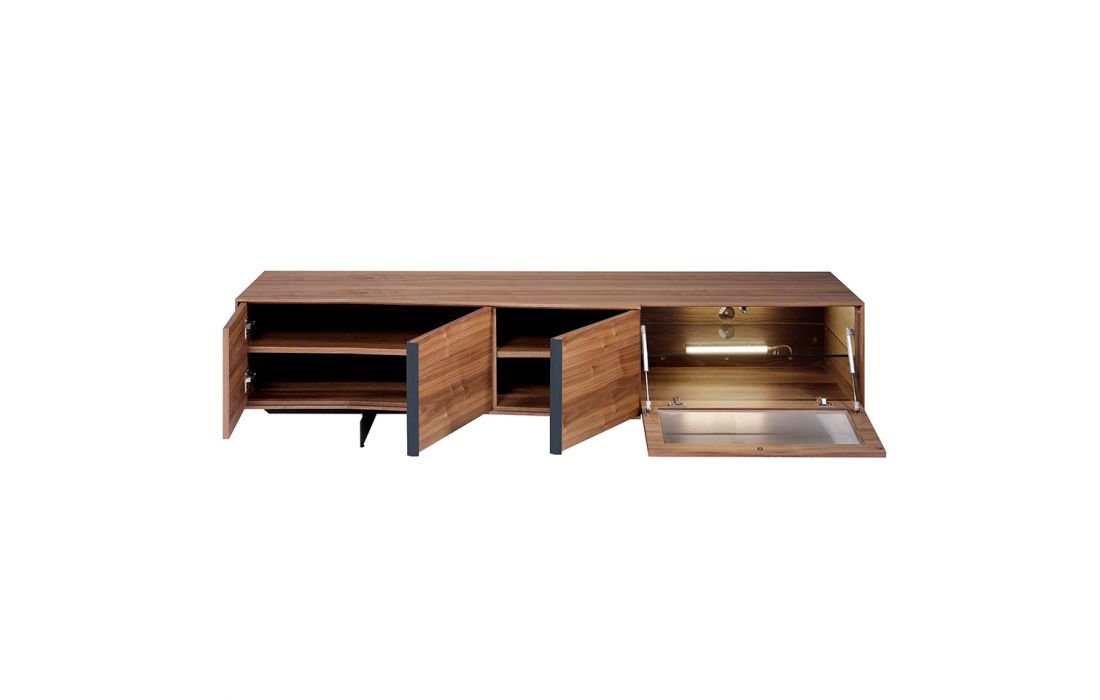 TV cabinet in natural walnut veneered wood with 2 doors and a hanging drawer with LED interior lighting. Black steel details and feet
