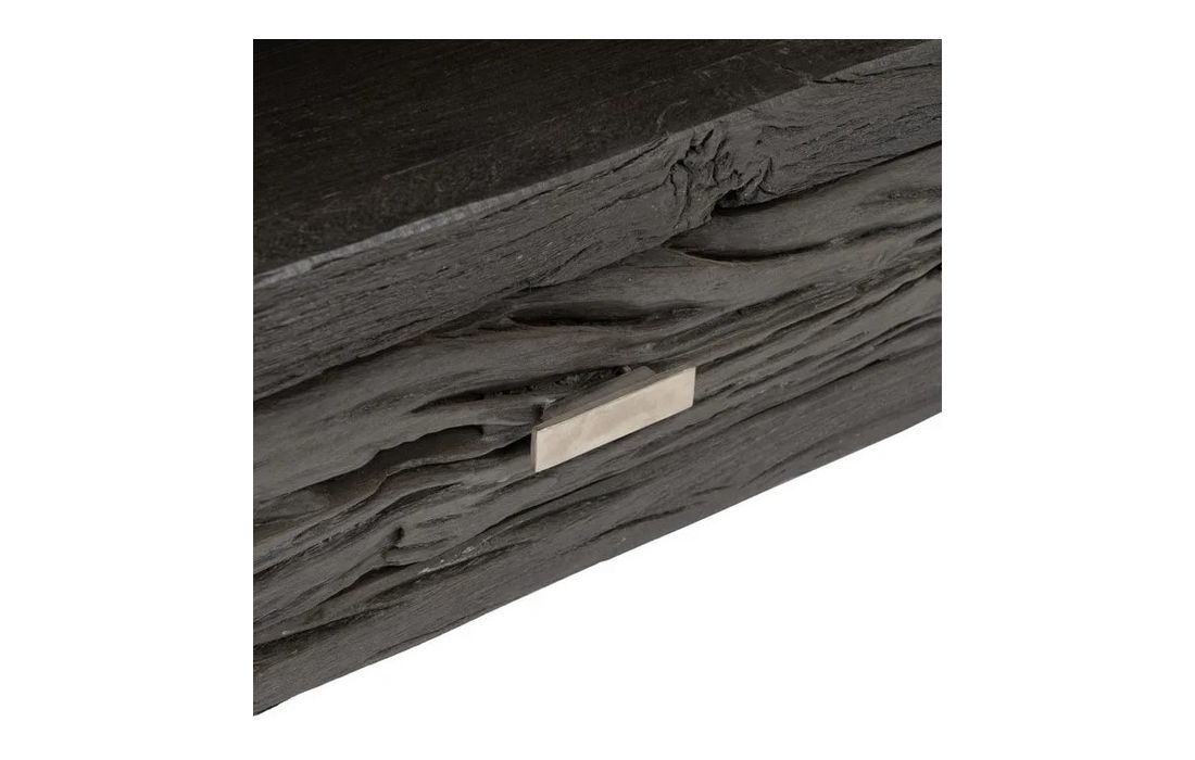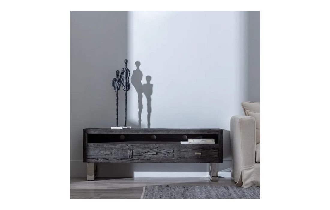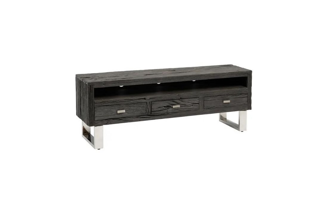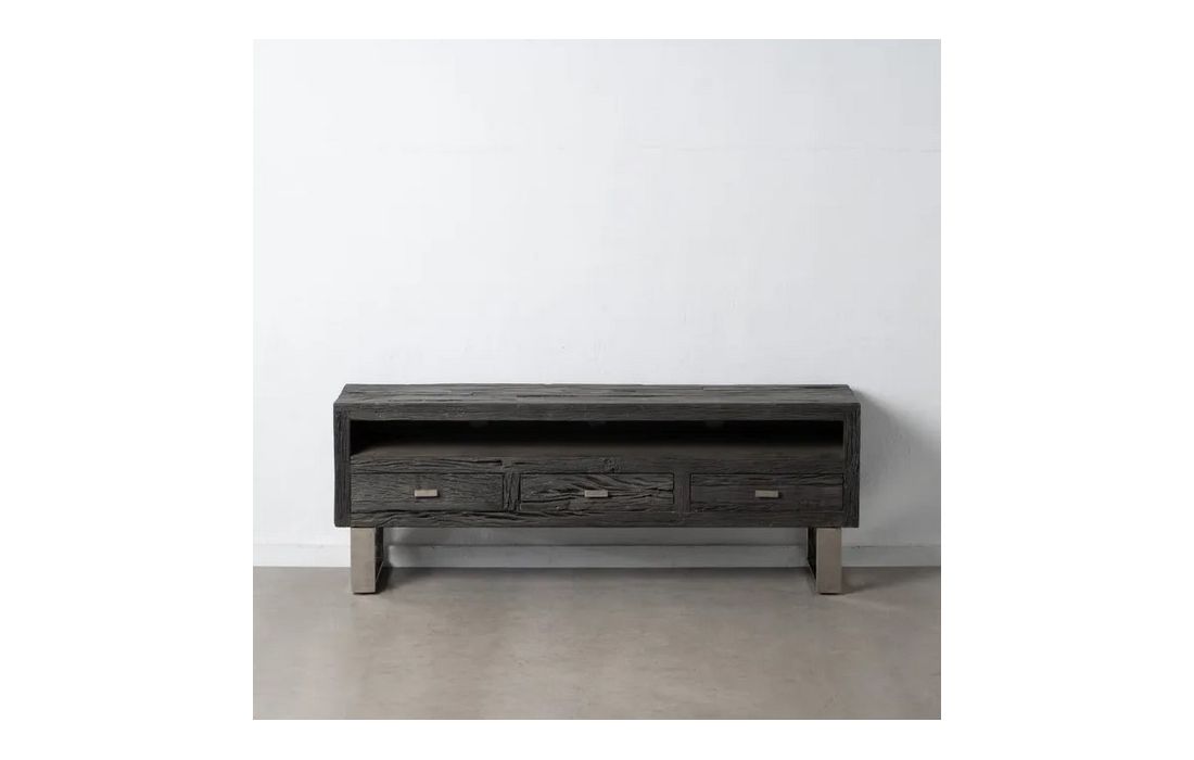 Black wooden TV base with 3 drawers, with metal handles and feet.