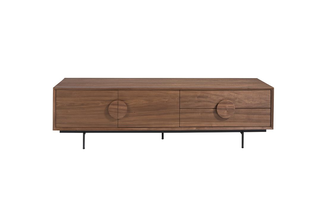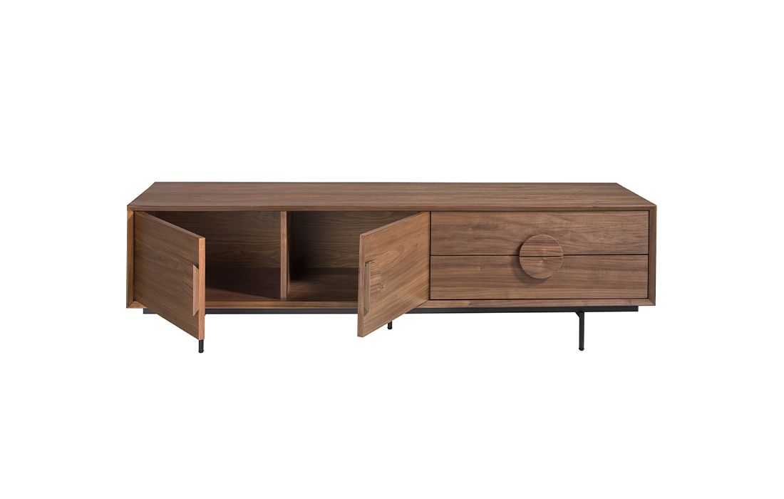 Walnut veneered TV stand with two drawers and two doors, black stainless steel base frame