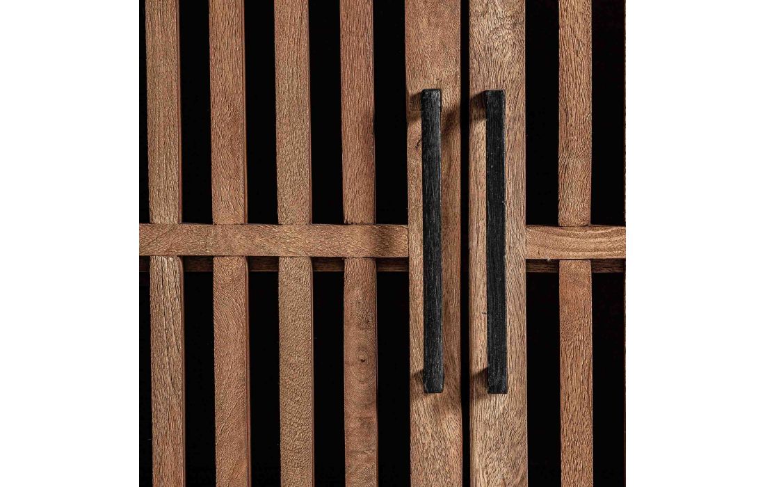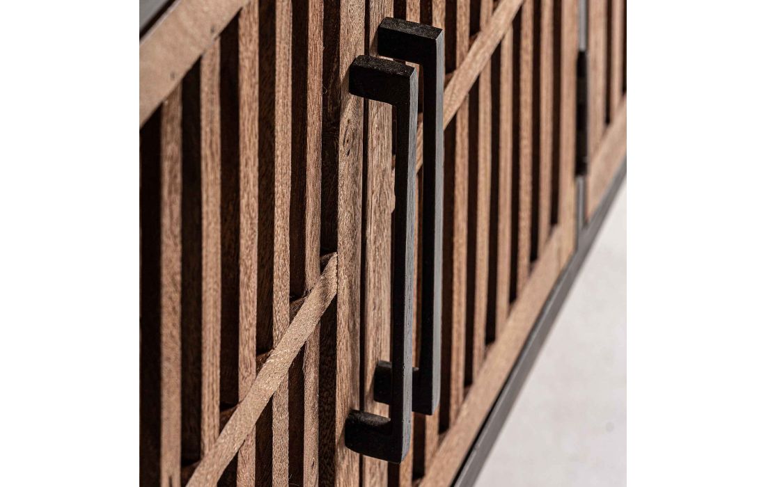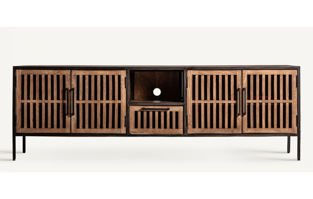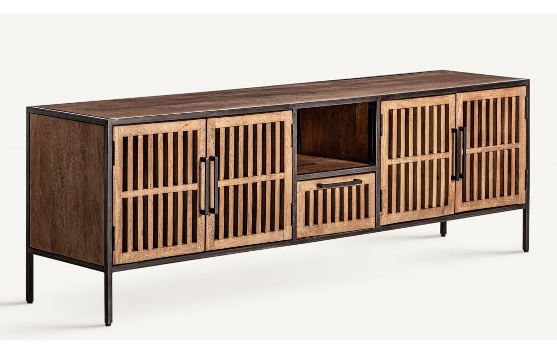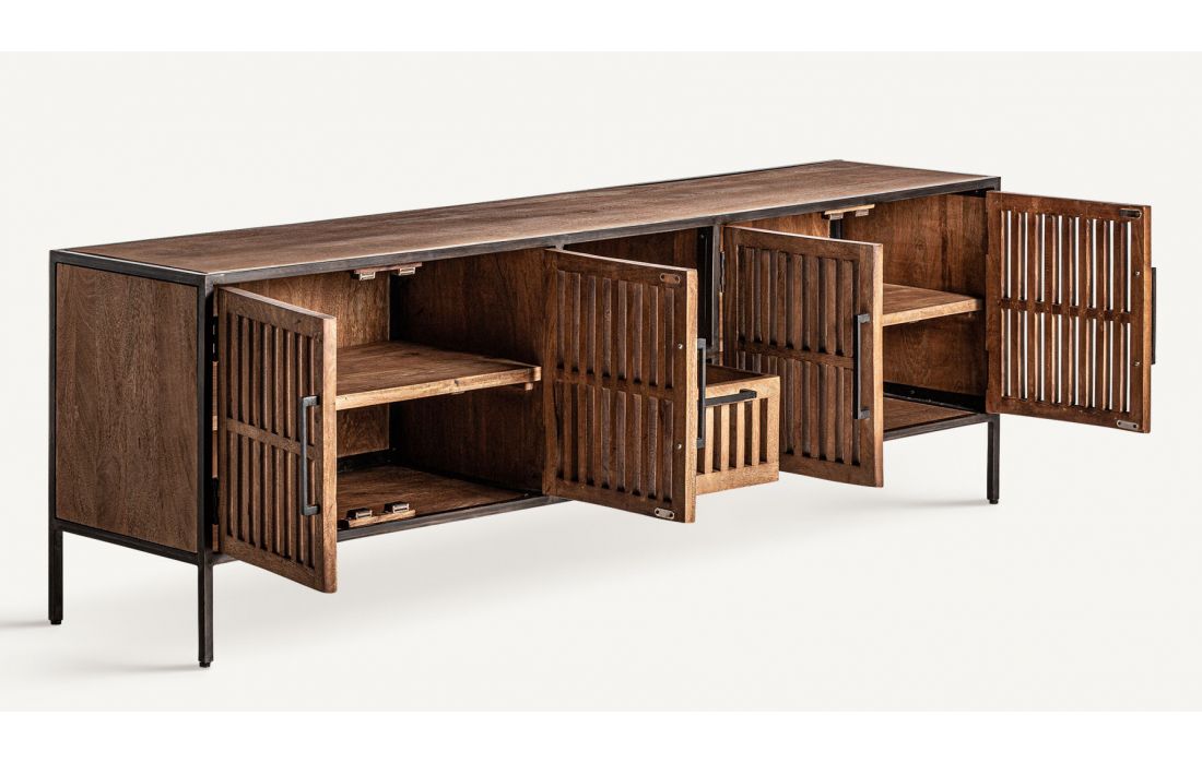 TV base with 4 doors and 1 drawer in mango wood in natural color and black iron