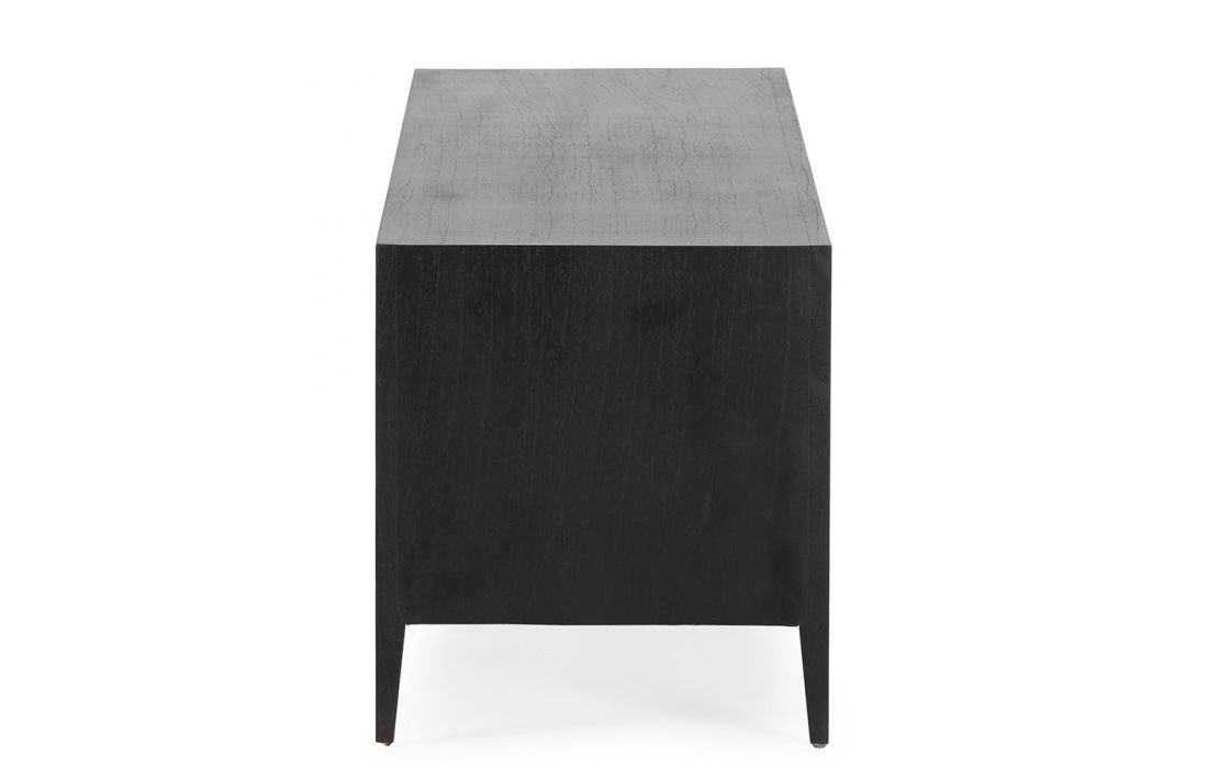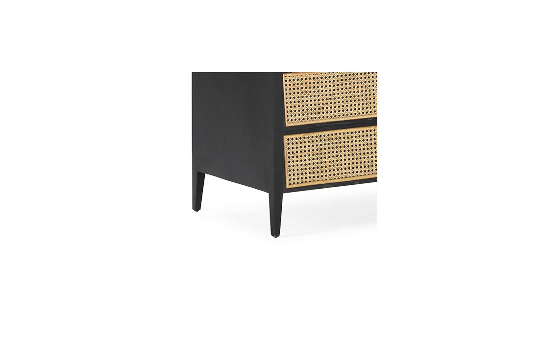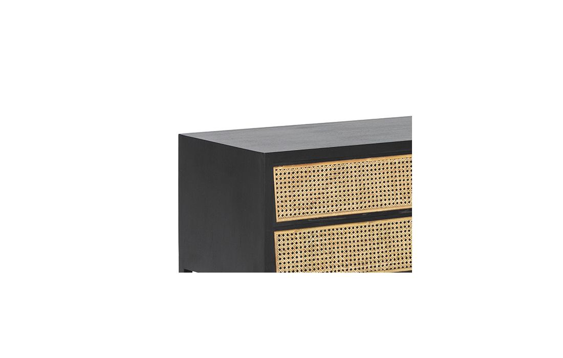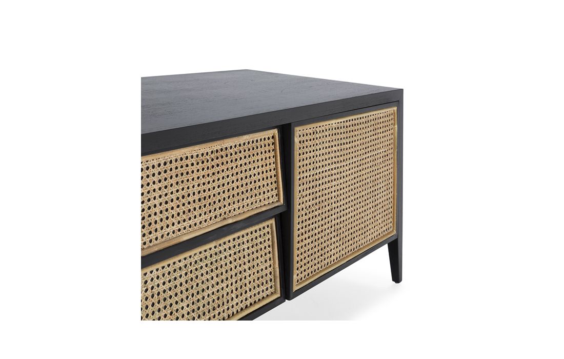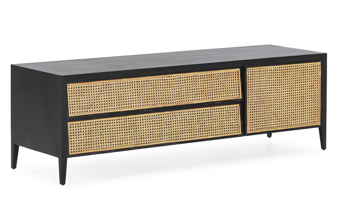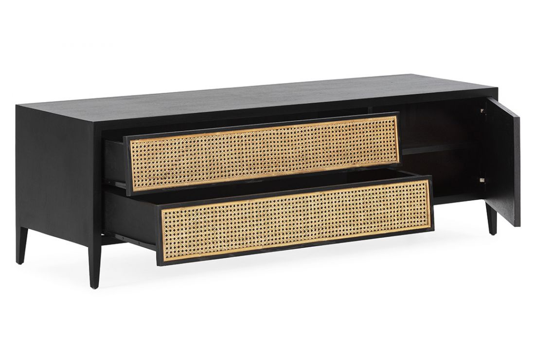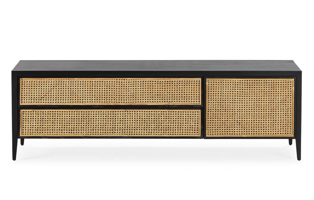 TV base with 2 drawers and 1 door in black cedar wood and natural straw