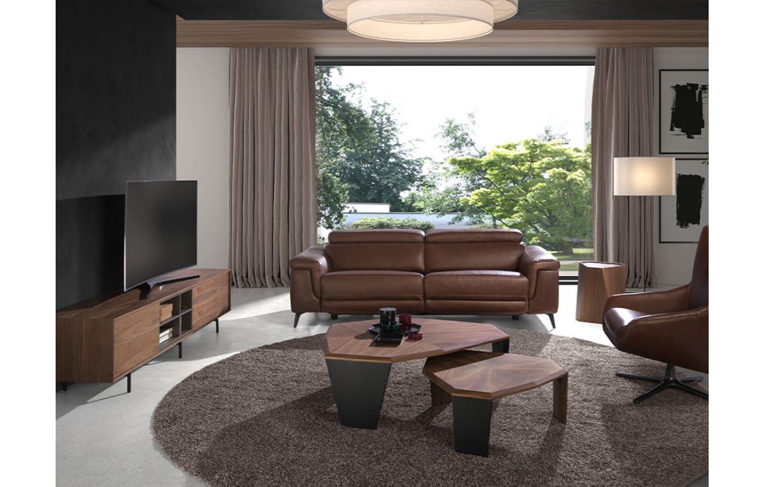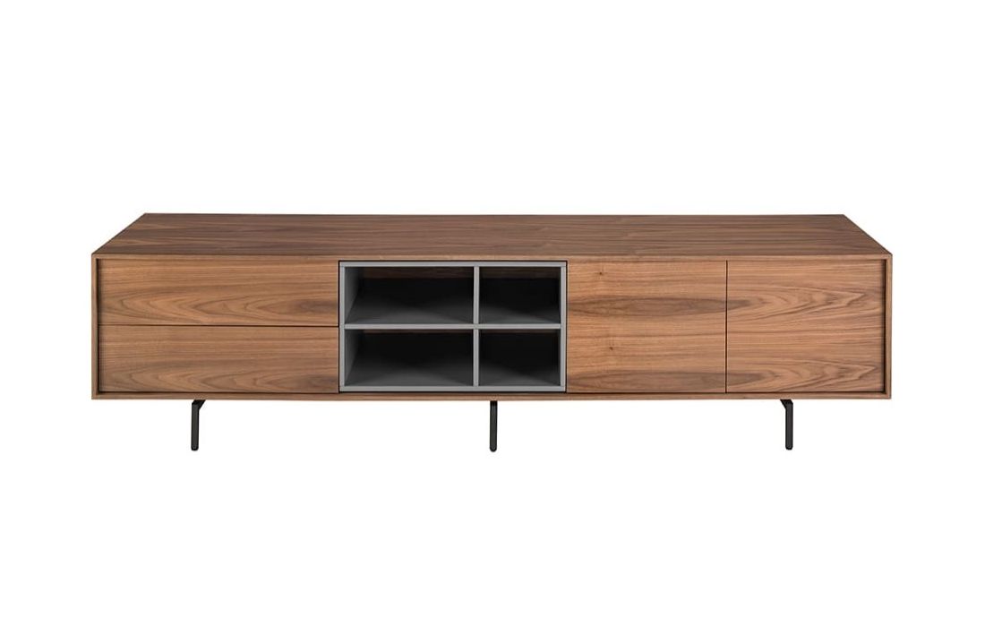Modern design TV base with natural walnut veneered wood structure and stainless steel legs painted in black epoxy. It has ample storage space with 2 drawers with a push and pull opening and closing system and 2 doors with a push and pull opening and closing system.