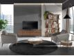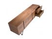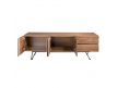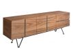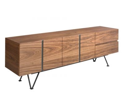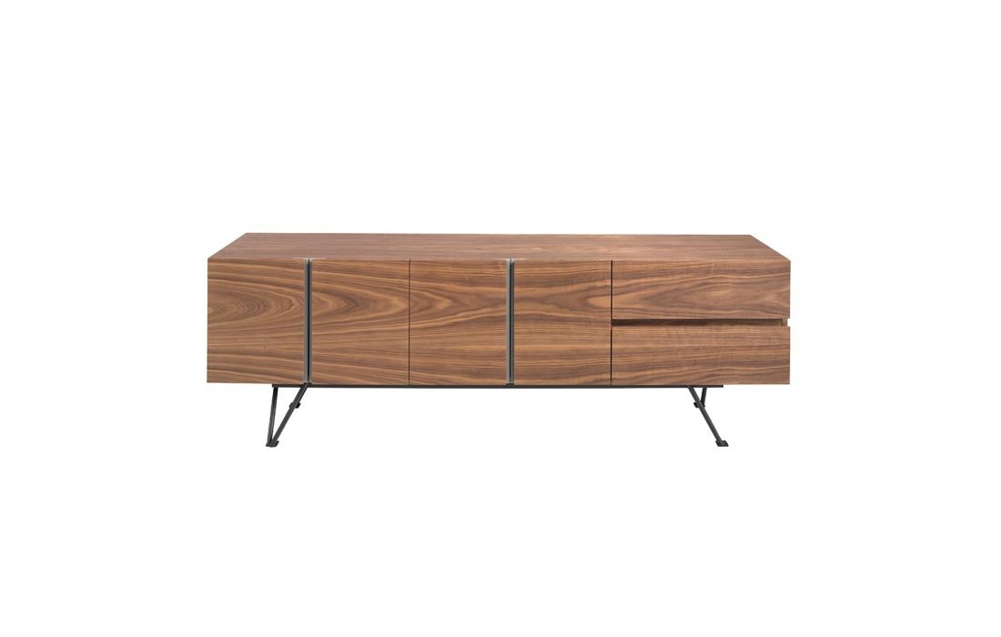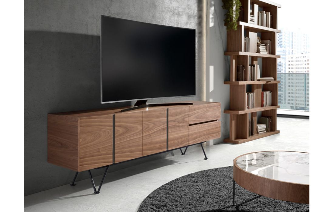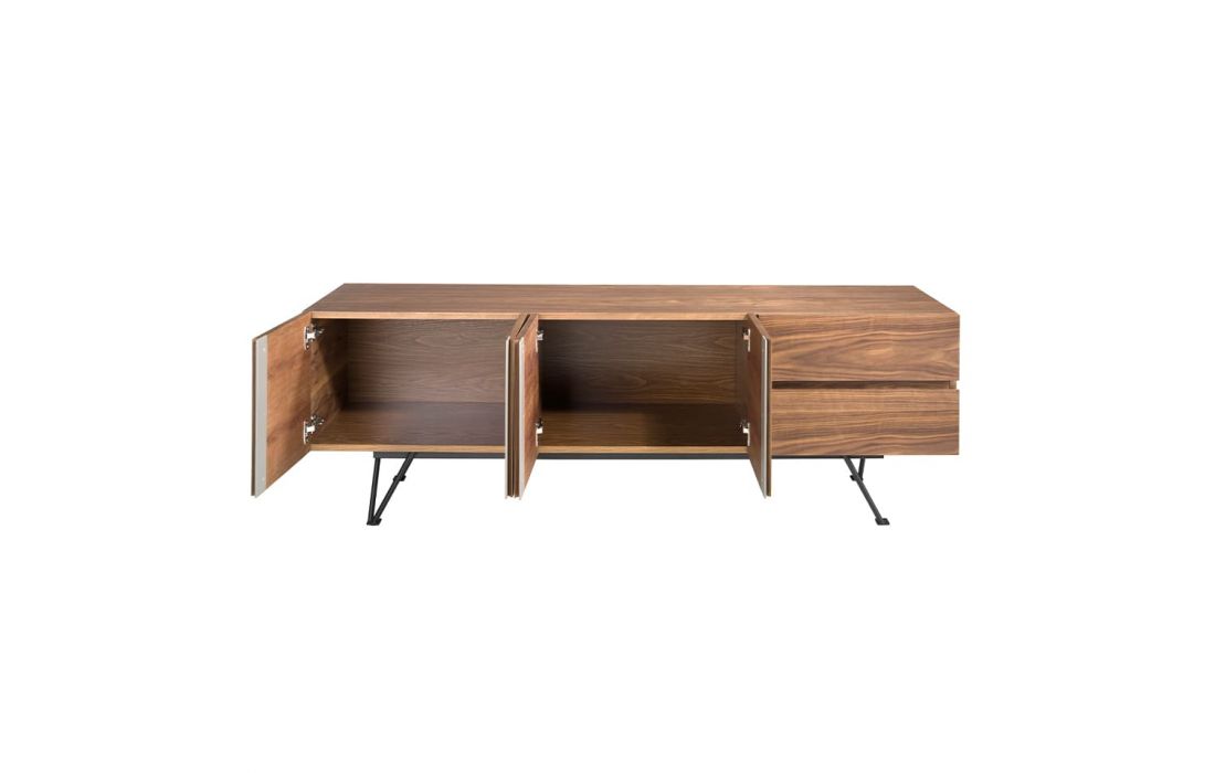 Modern design TV cabinets with natural walnut veneered wood structure and stainless steel legs painted in black epoxy. It has ample storage space with 2 drawers and 2 doors with finger opening system and soft closing system.