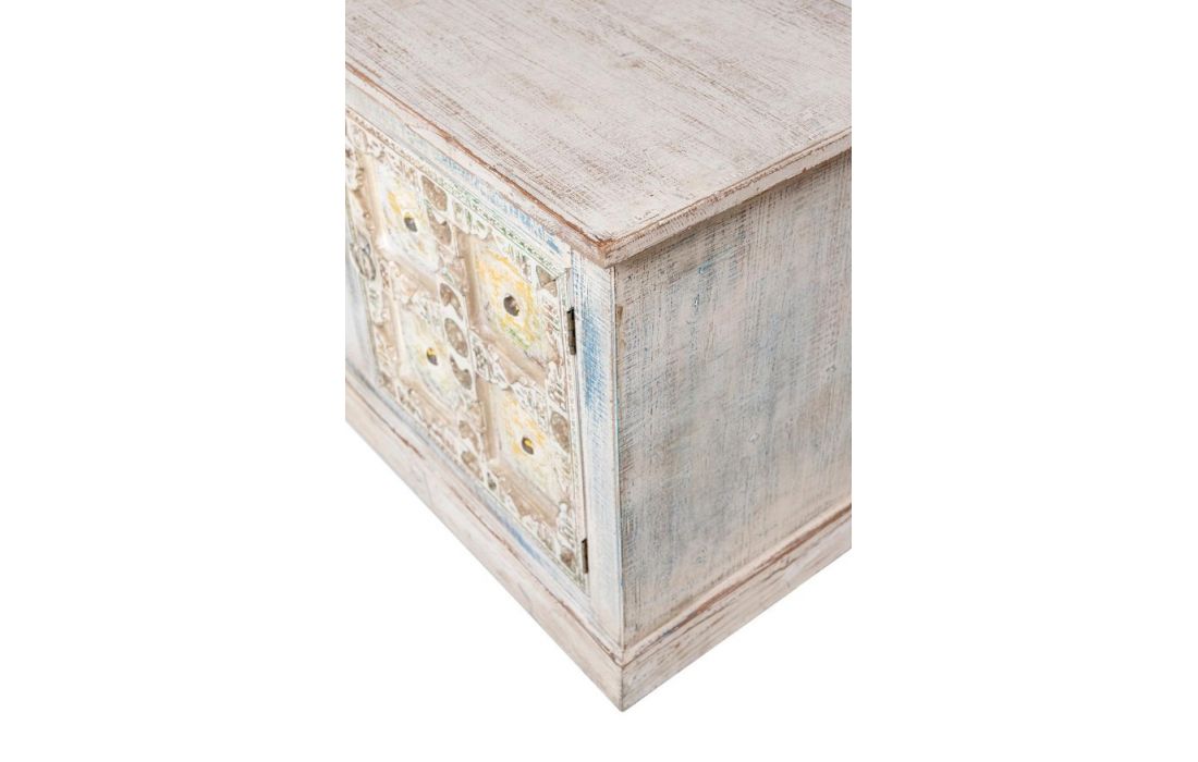 TV base with wooden structure with 2 doors.