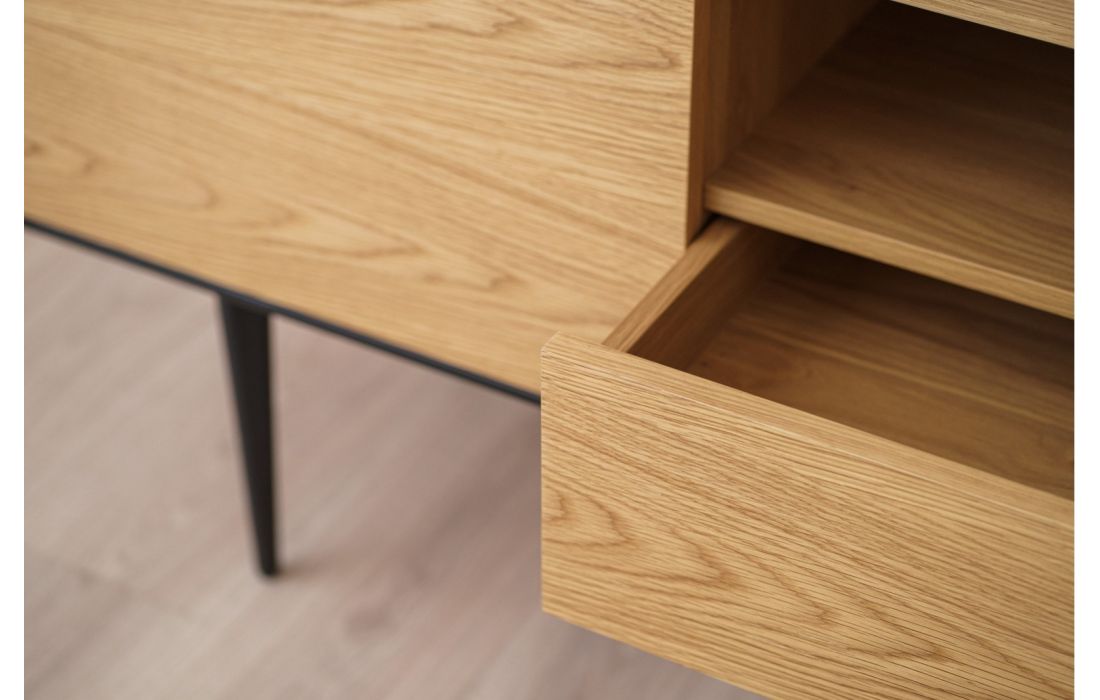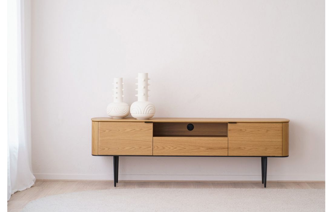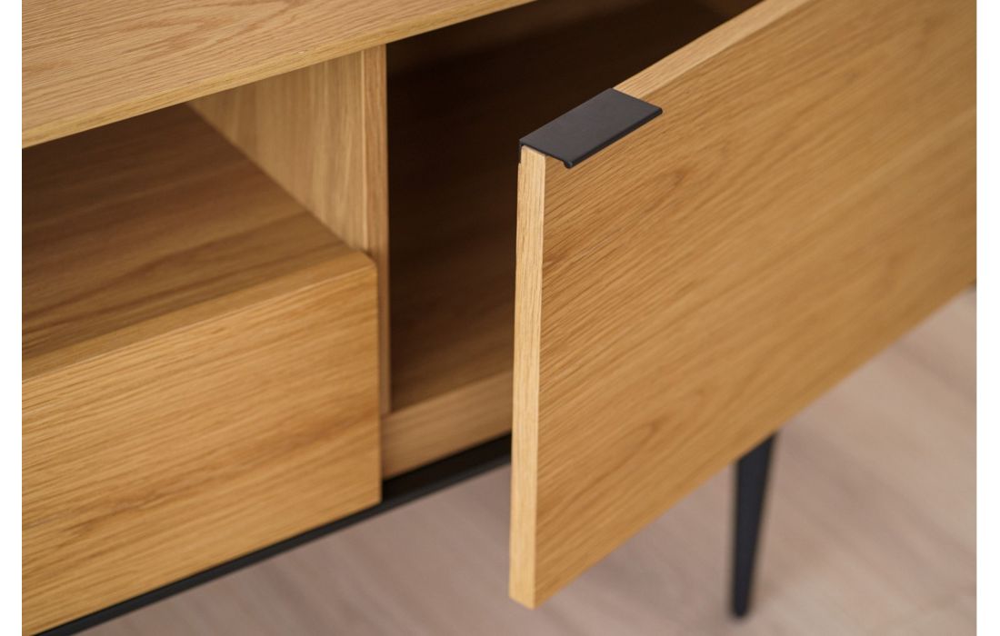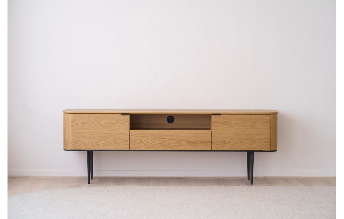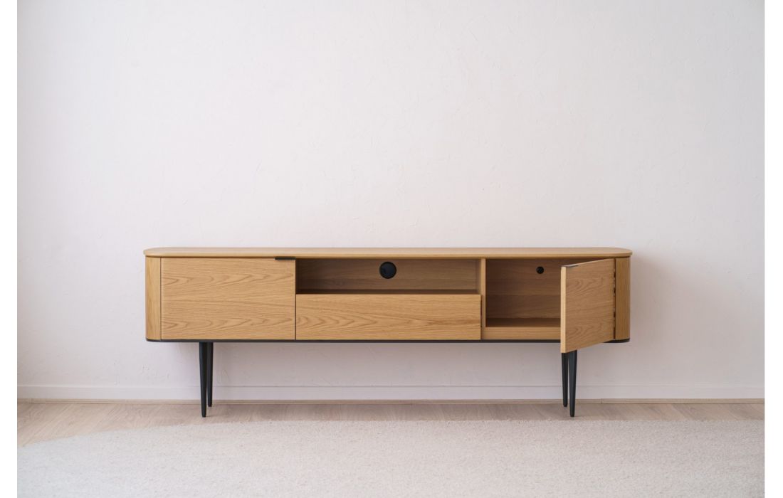 TV base with oak wood structure with 2 doors and 1 drawer. Metal feet.
