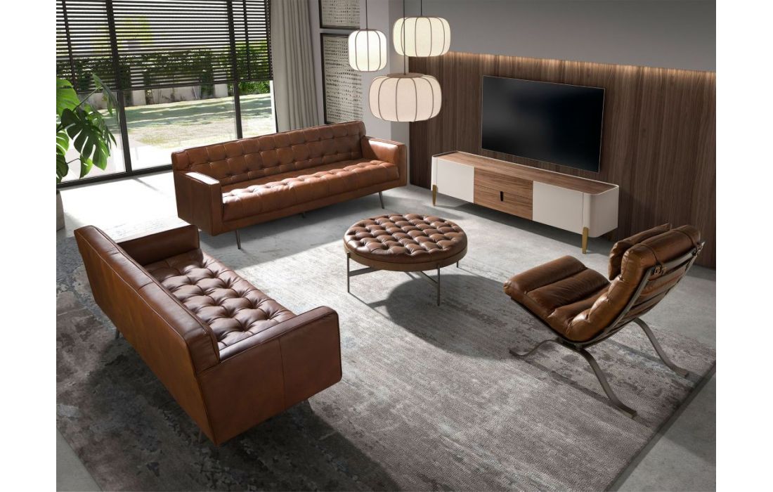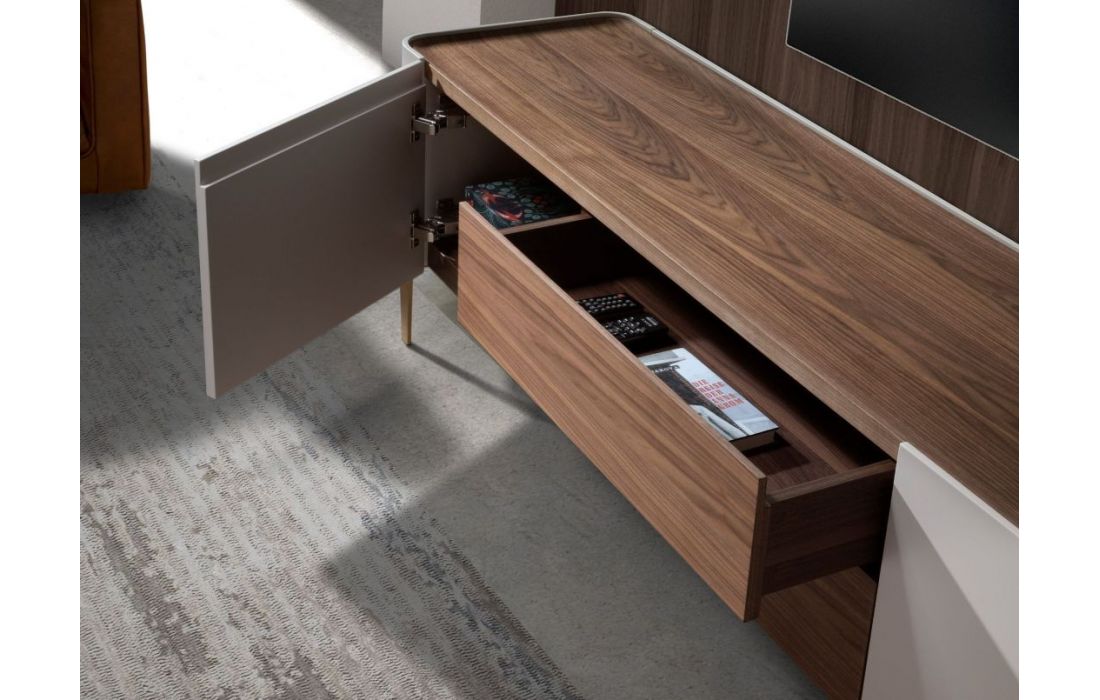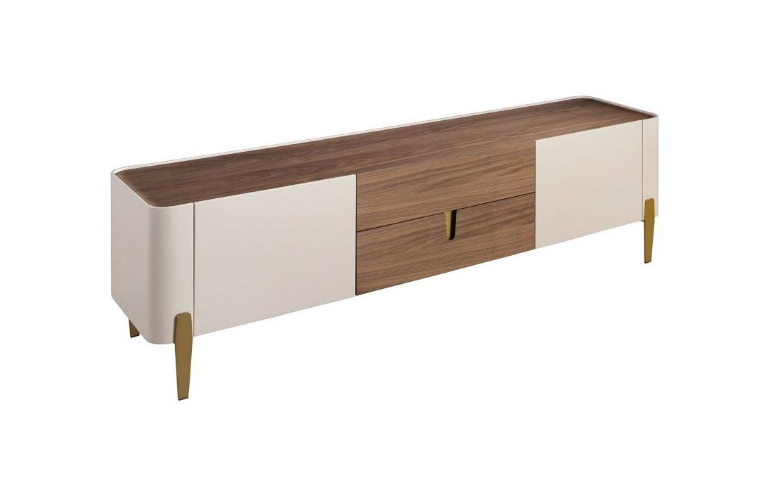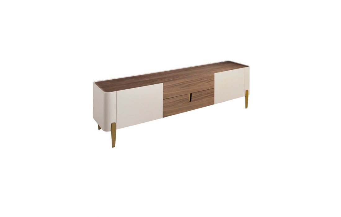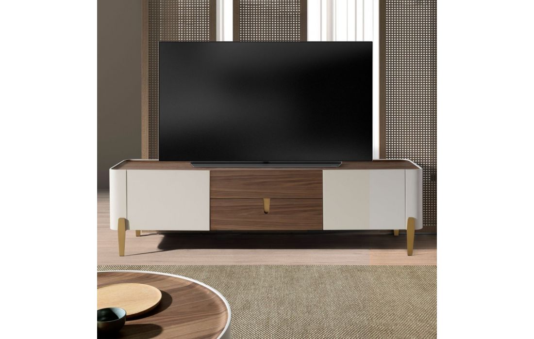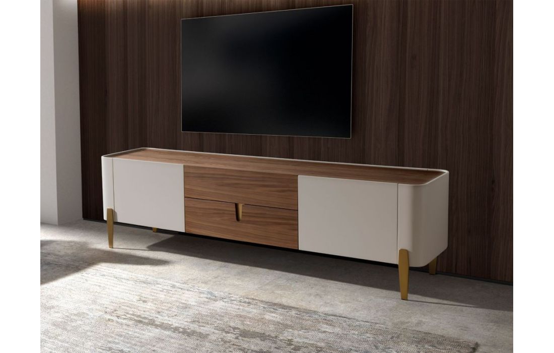 Modern design TV base with natural walnut MDF and beige lacquered MDF structure, stainless steel legs, natural walnut MDF top and its original stainless steel detail and 2 and 2 doorsRecipient :