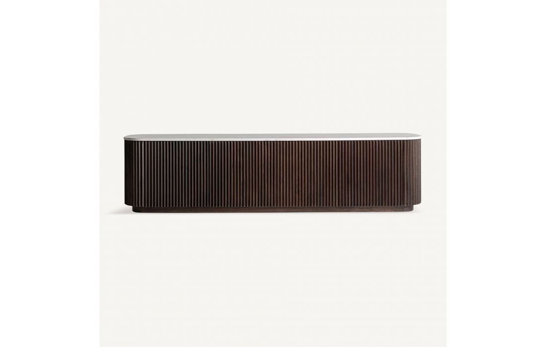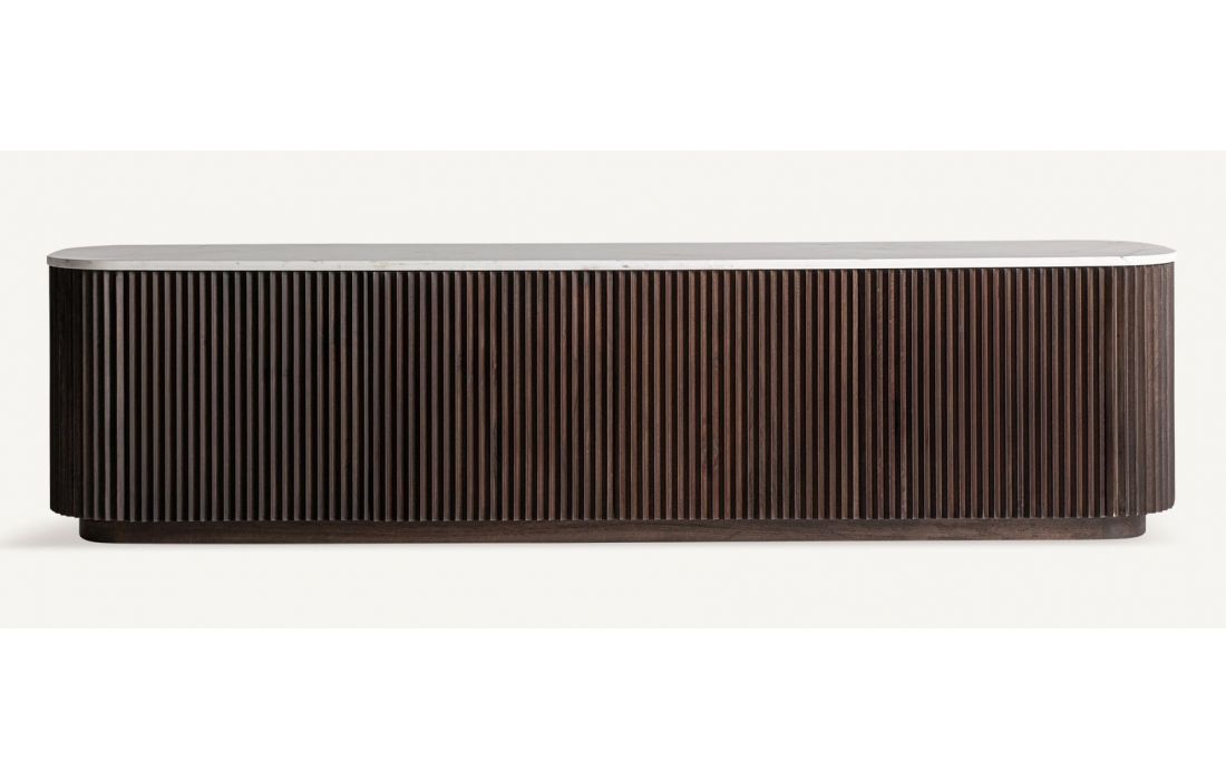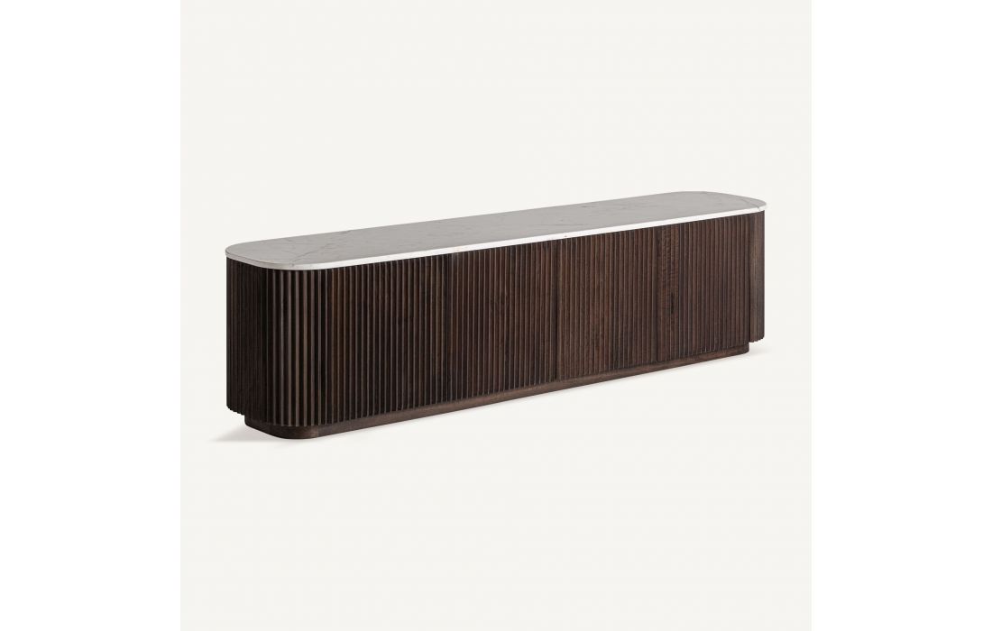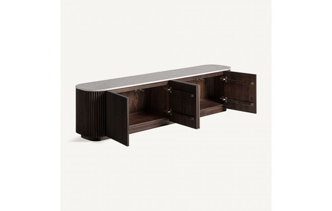 The CENVES TV stand combines the warmth of wood with the sophistication of white marble.Its art deco design brings visual balance and functionality.A piece that elevates any living room with understated majesty.