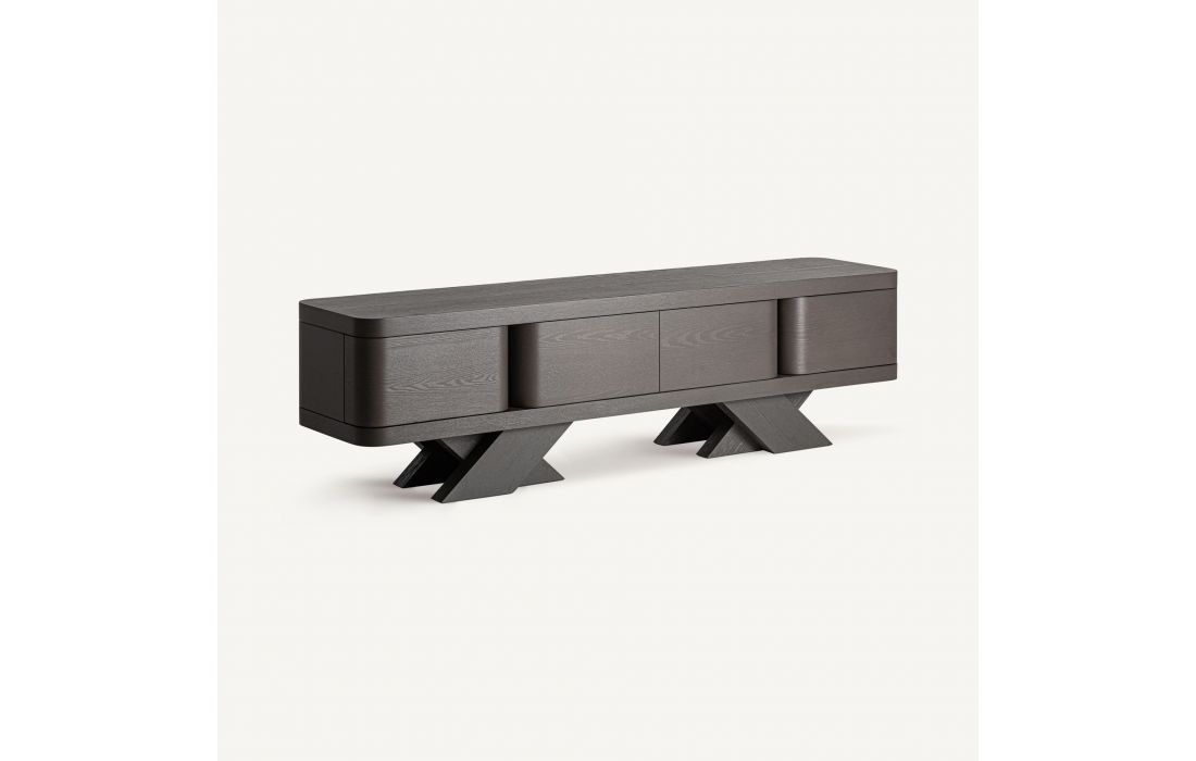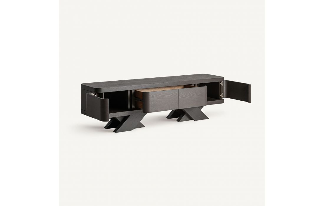 This TV stand features an Art Deco aesthetic with a geometric design in black oak wood; this piece of furniture adds a modern and sophisticated touch to your living room.Recipient :