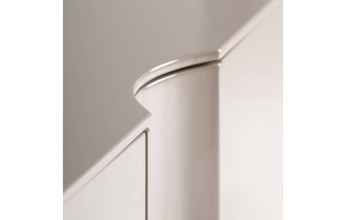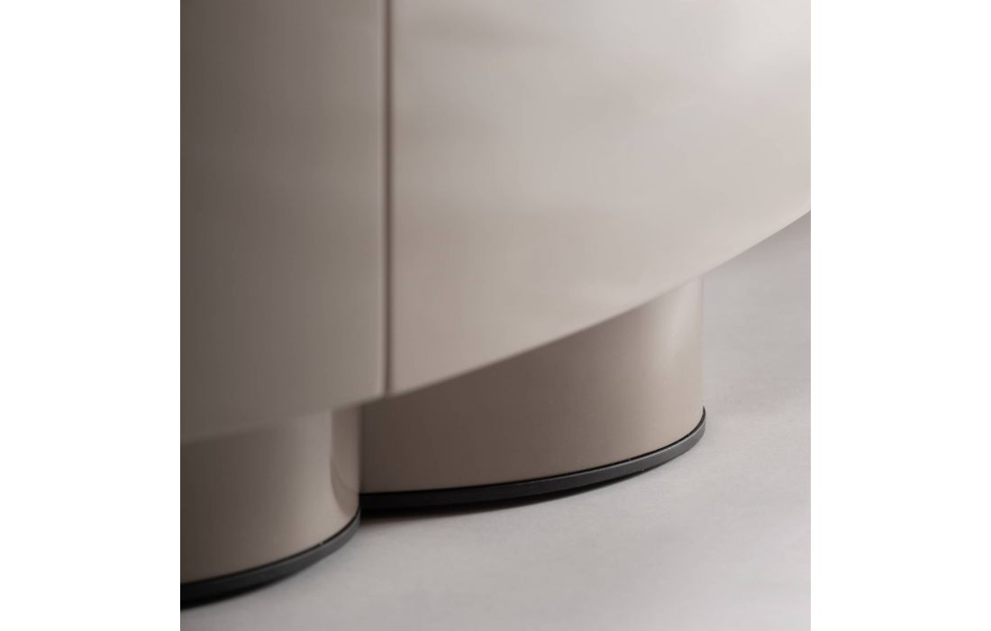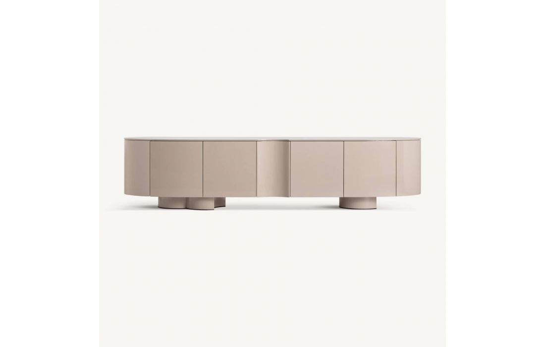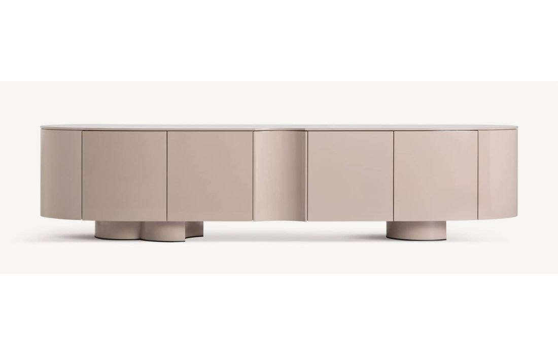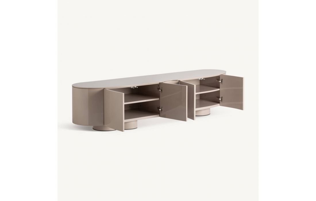 This lacquered MDF TV stand stands out for its simple lines and balanced shape, with a contemporary design that brings serenity and presence to any space.