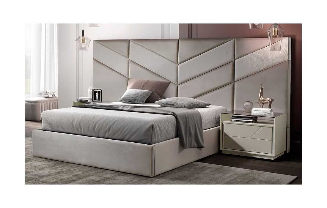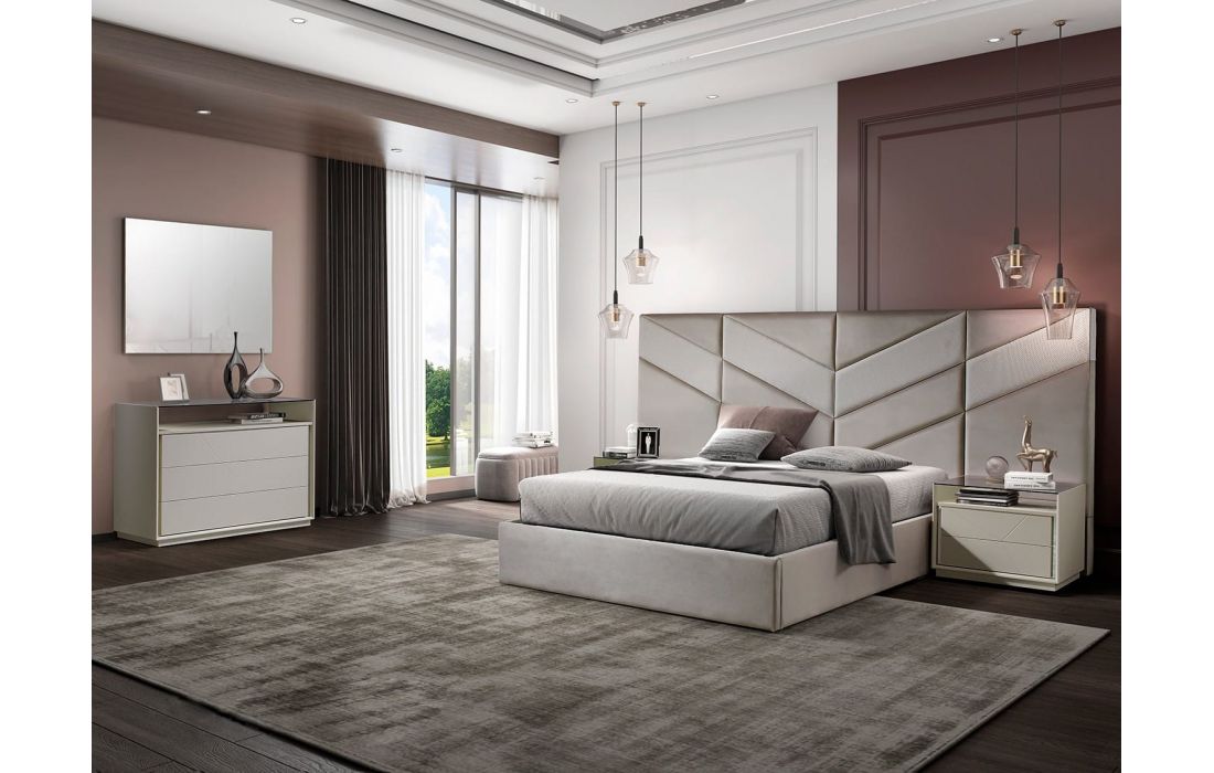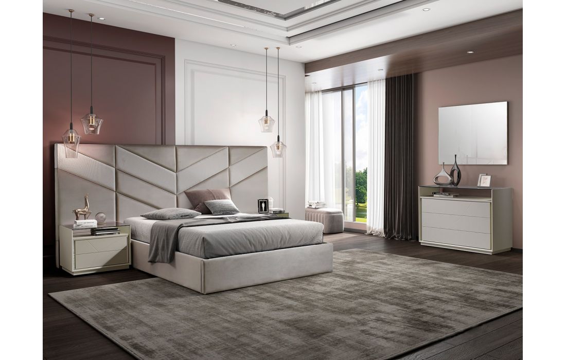 Matt white lacquer and gray lacquer. Bed upholstery: Gray Denim