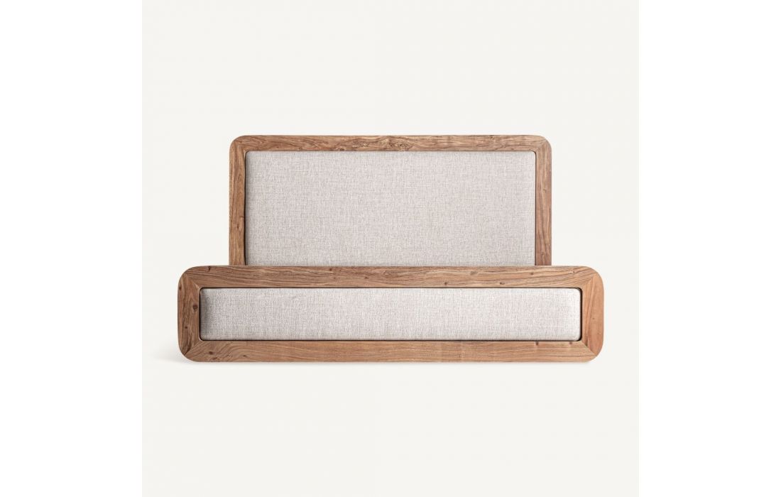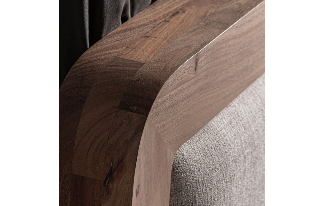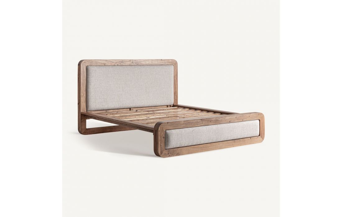 Bed made of acacia wood and upholstered in mixed beige acrylic and polyester, combines firm structure with soft fabricRecipient :