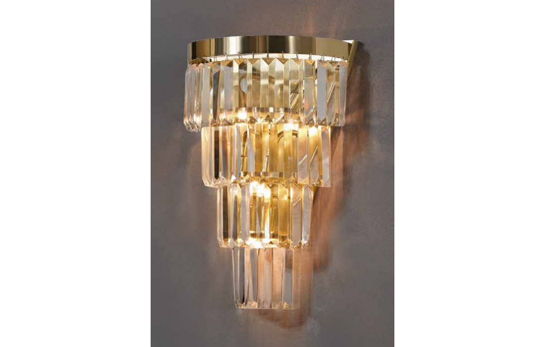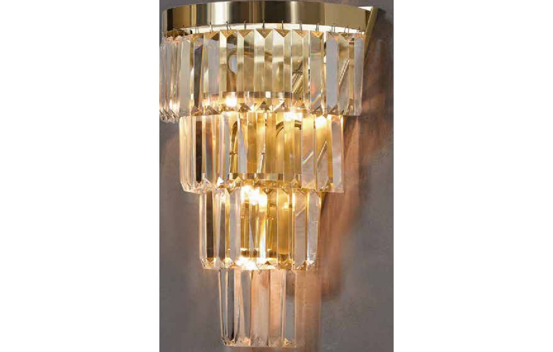Wall lamp in light tones of the crystal and the gold of the structure. Modern and timeless, make it ideal for lobby or even other types of spaces as it is easily adaptable.